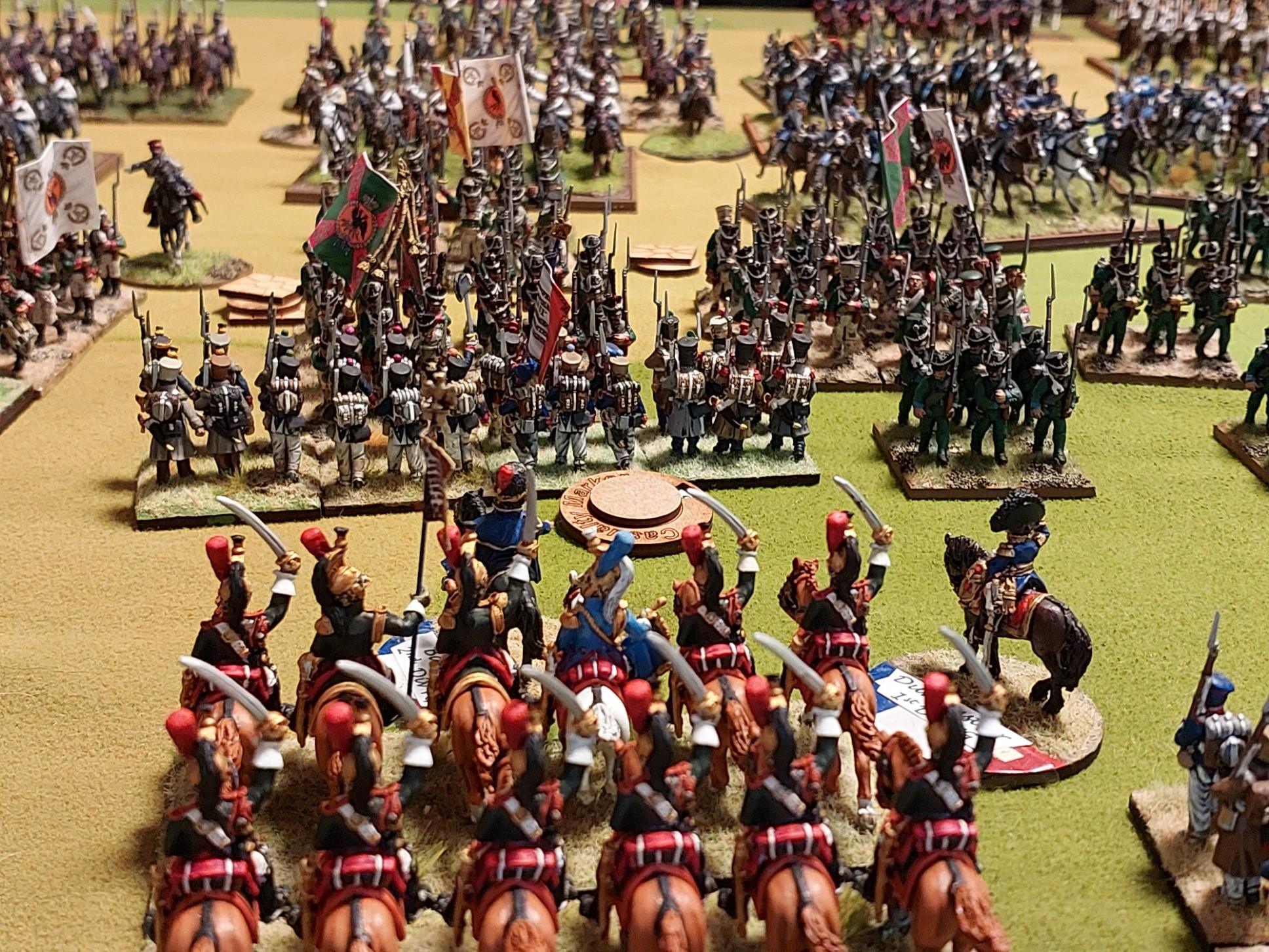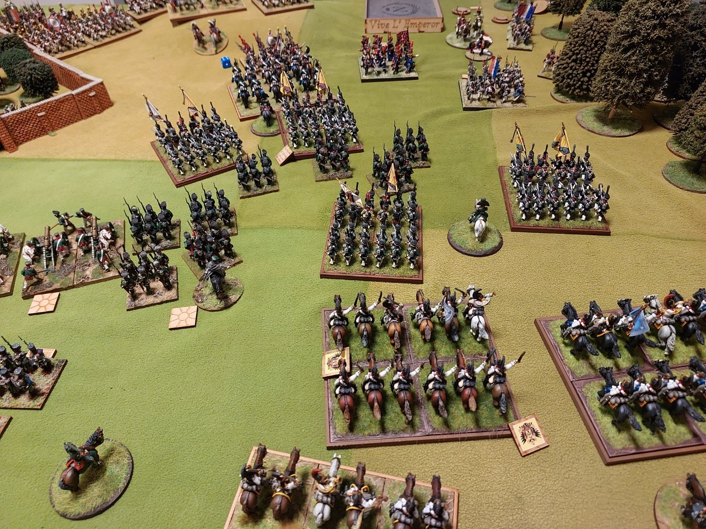 A bit further on…and…no French Guard cavalry……Russ replaced his dice a couple of times…..there are 8 Allied Cuirassier units over here…and 3 pointy stick units.