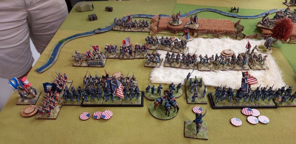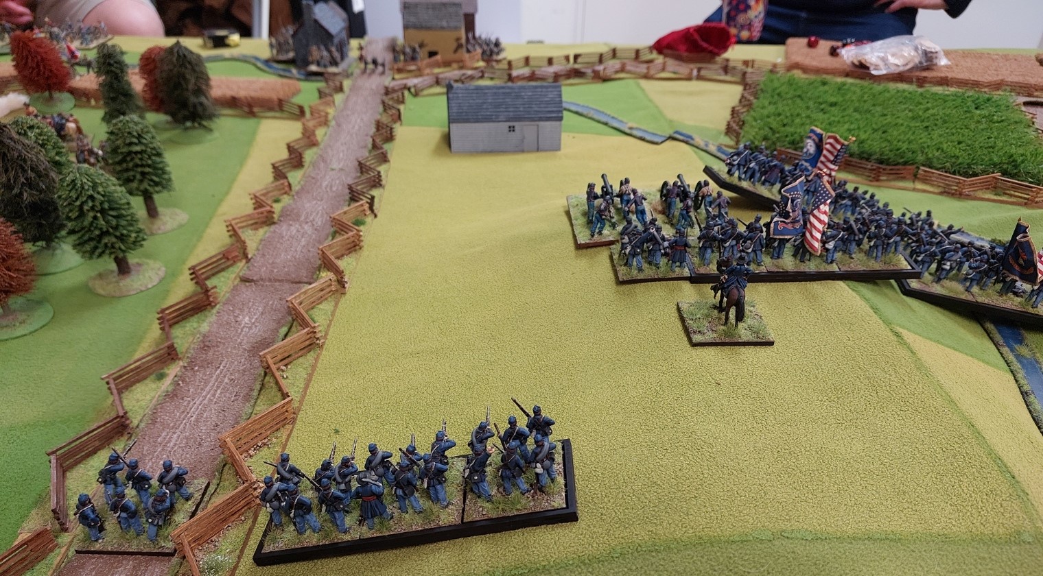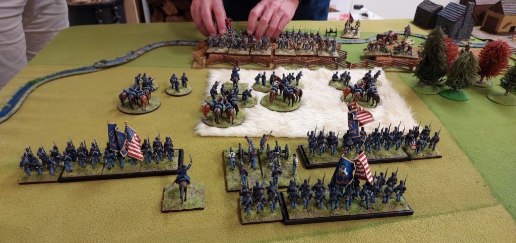The Union had 3 brigades with 2 deployed on their left and one in the centre right. They had no Division commander, and one of the 3 brigades was a rating 7. A fourth would arrive if certain conditions were met. (they didn’t in time)