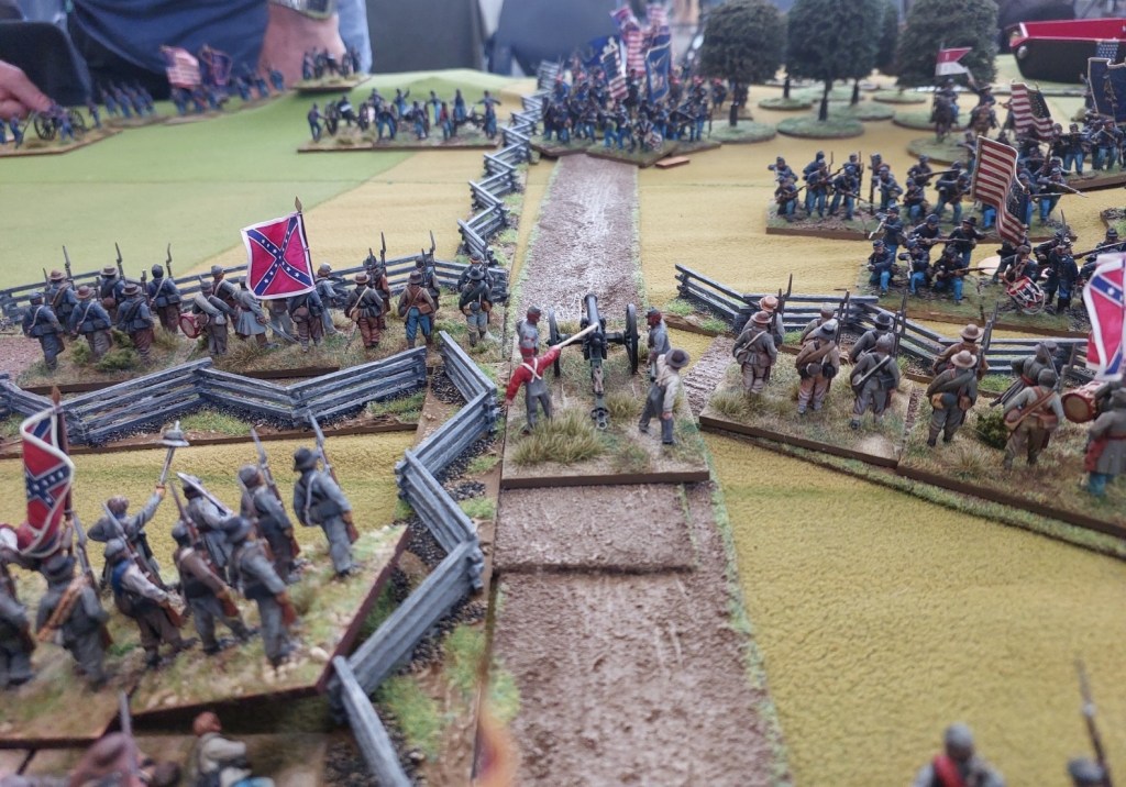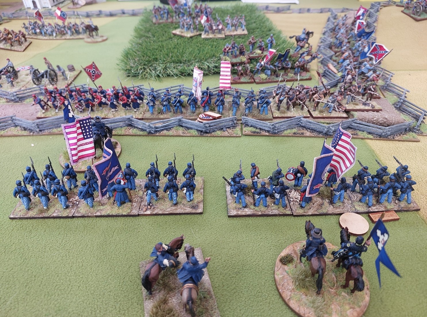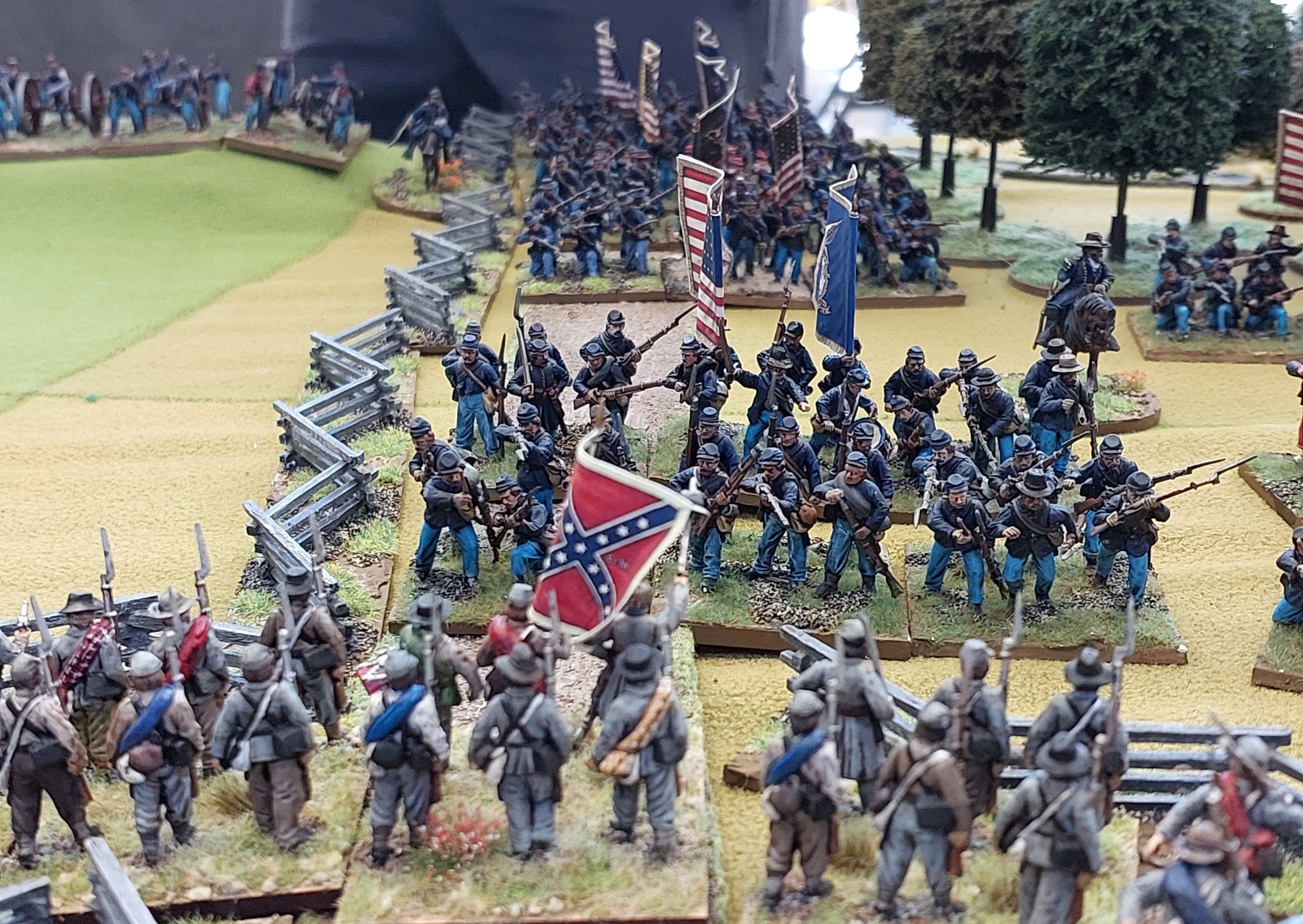 Yet another Blunder…this time a good one!(If you are Union that is) Getting infantry to attack other infantry frontally is not easy, unless of course you do as SteveT did…blunder and the result is a charge. So 3 regts went in. One succeeded in winning the combat…the Confederate die rolls for shooting had been appalling all game on this road fence.