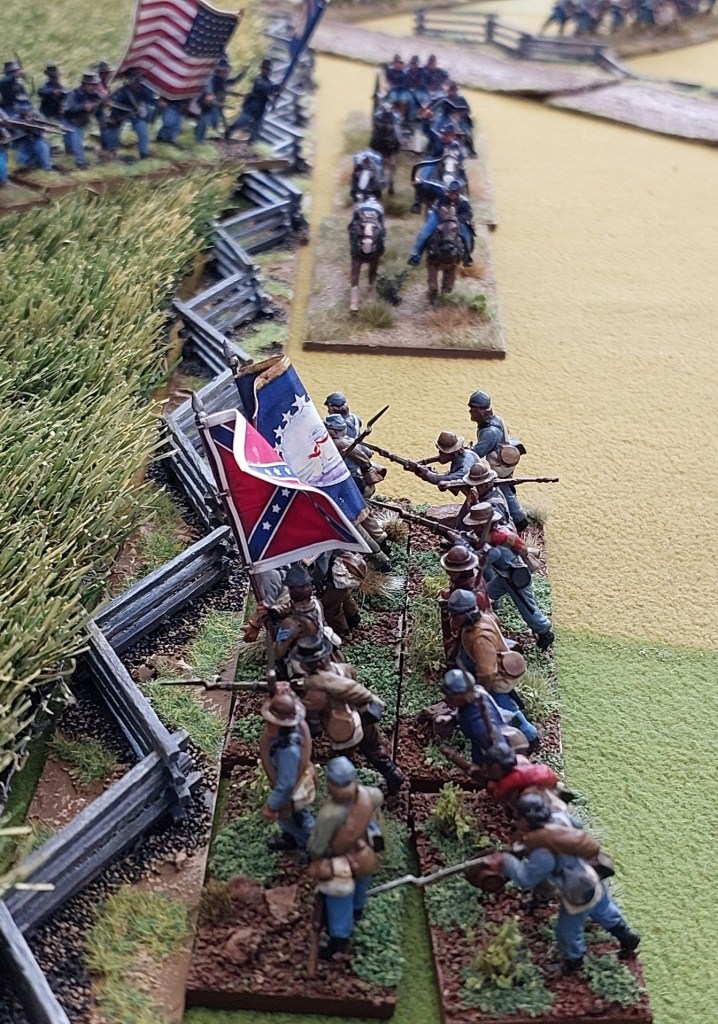 Now over on the Confederate left flank several turns have gone by. Robert had a Union battery blunder and ride into the cornfield all by its self. Then he had failed move orders for brigades moving on so StephenC decided to move out from his position and attack them. Sadly his scouts failed to report the approaching Union Force of George Greene who some fool had rated as a Command 9 for the battle!(Okay..it was me). What a juicy target.