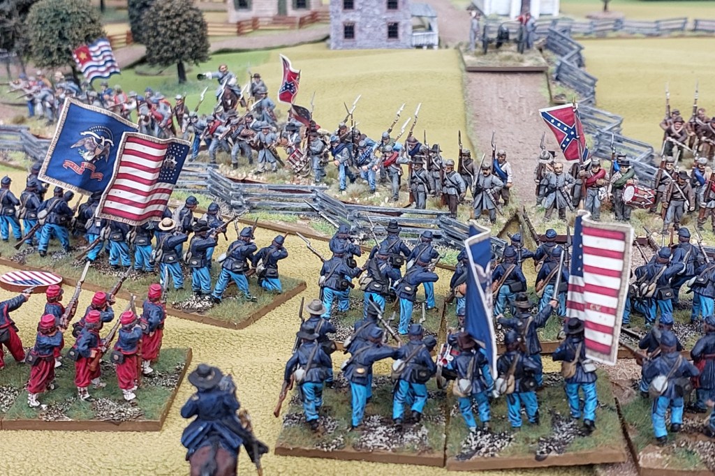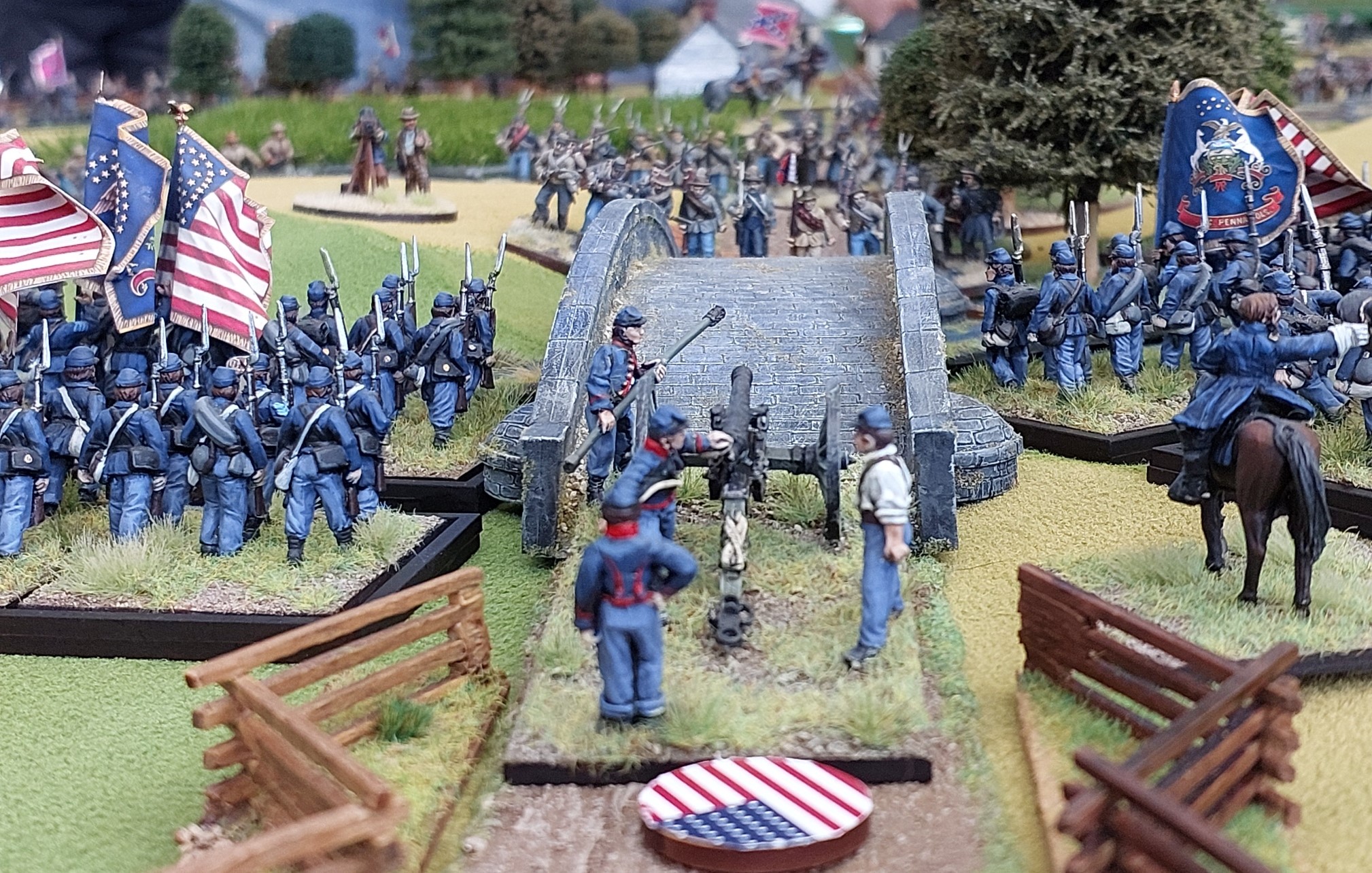 Over by the bridge Goldies troops advancing, Mikes Confederates in the field are retiring.