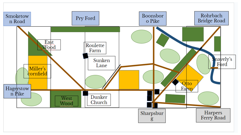 The Confederates set up from the edge of the West Wood, the hill in front of the Dunker Church, along the sunken road , then along the Bridge Rd to the bridge and then on the southern side of the stream.