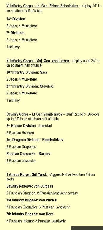 The table was 15 foot x 6 foot with the Russians set up on the Western side of table and deployed on the Southern half of the table. The Prussians to arrive on turn 2 from the North.
