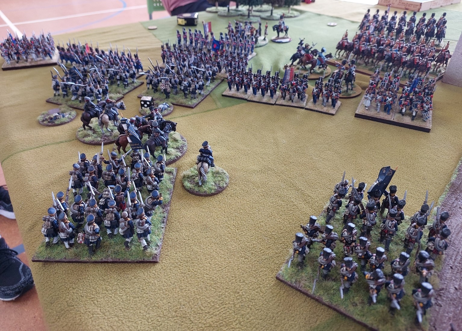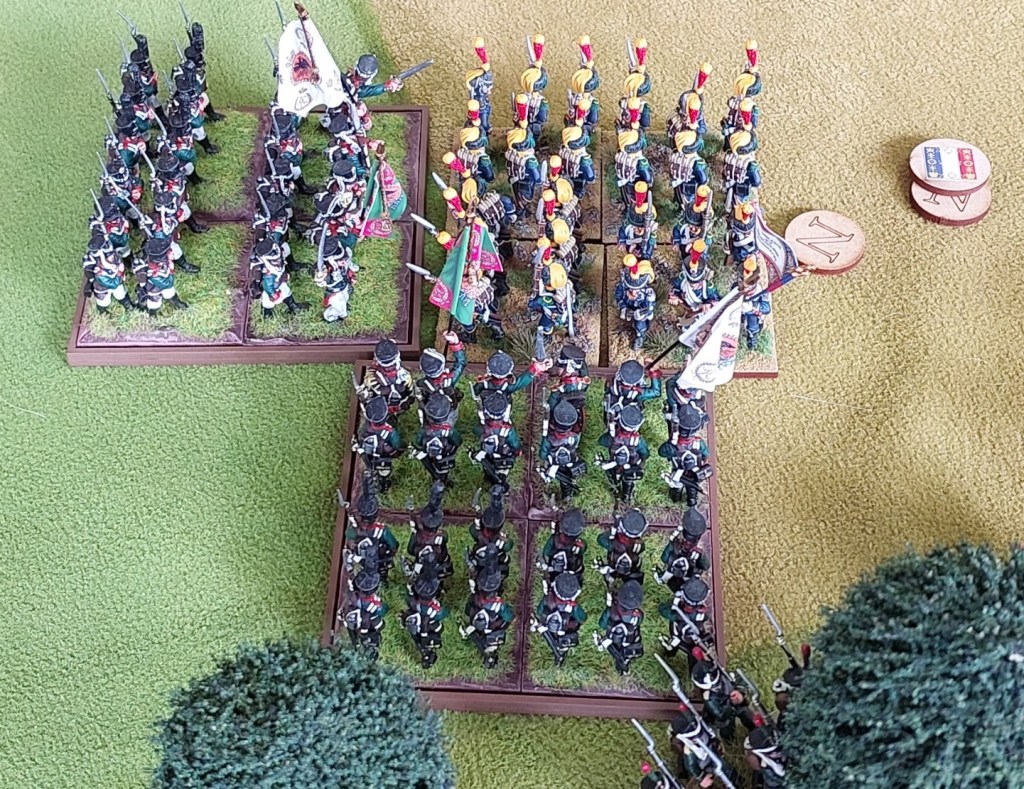 Sadly my camera played up…the light gets dodgy in the hall in the afternoon and the pictures from this flank were to blurry. But I had taken the flank wood…. put batteries either side of it and was moving 8 undamaged bttns forward supported by Dragoons. Below is final part of turn…Dragoons forced a square and 2 columns hit it…French survived!
