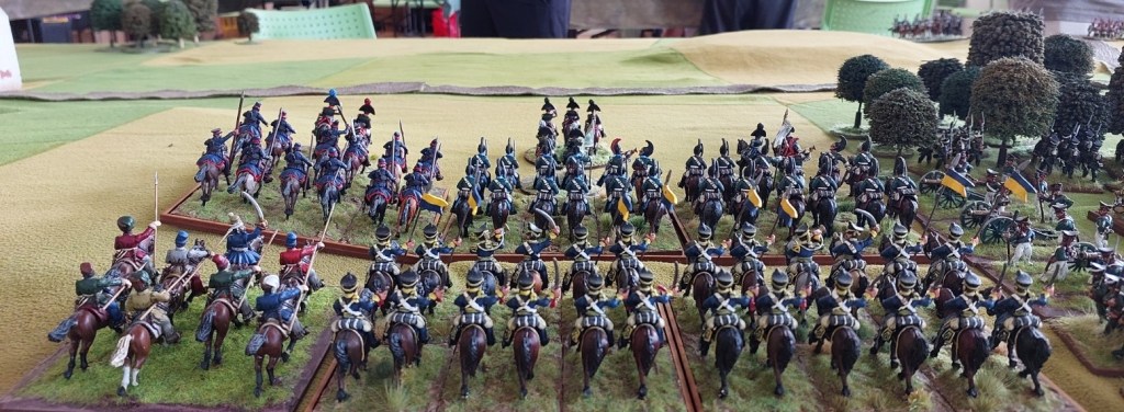 So Goldie arrived from the North. He moved his 4 cavalry on….not any infantry. So 2 Dragoons and 2 Landwher cavalry marched on just so they could give Russ the pleasure of introducing his massed Guard cavalry to them.