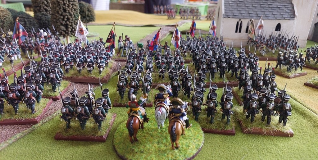 The view of the arriving French. From the top to bottom they are: 2 divisions of Conscripts to the front, Middle Guard advancing up road, Old Guard to Northside of road, Garde d’Honner with the Conscripts, Young Guard cavalry then Old Guard cavalry with a horse battery. The 2 Guard batteries were off table.