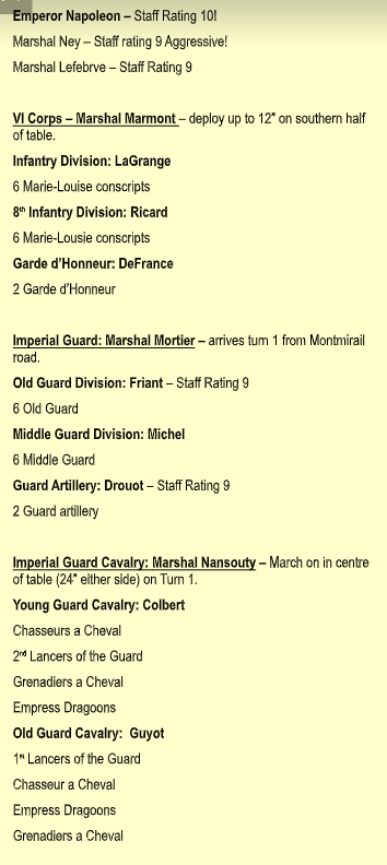 The French Orbat is an impressive list of units! I never quite got my head around it totally…but Rob was Marmont, Rob also had the Division of the Middle Guard and also started with the Young Guard cavalry but as the game developed Russ took over. He also had Ney. Russ had the Old Guard Cavalry, Old Guard infantry and the artillery and absorbed the Young Guard cavalry as well plus Napoleon and Lefebrve!