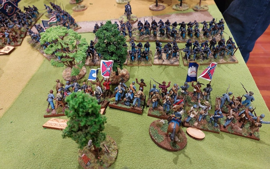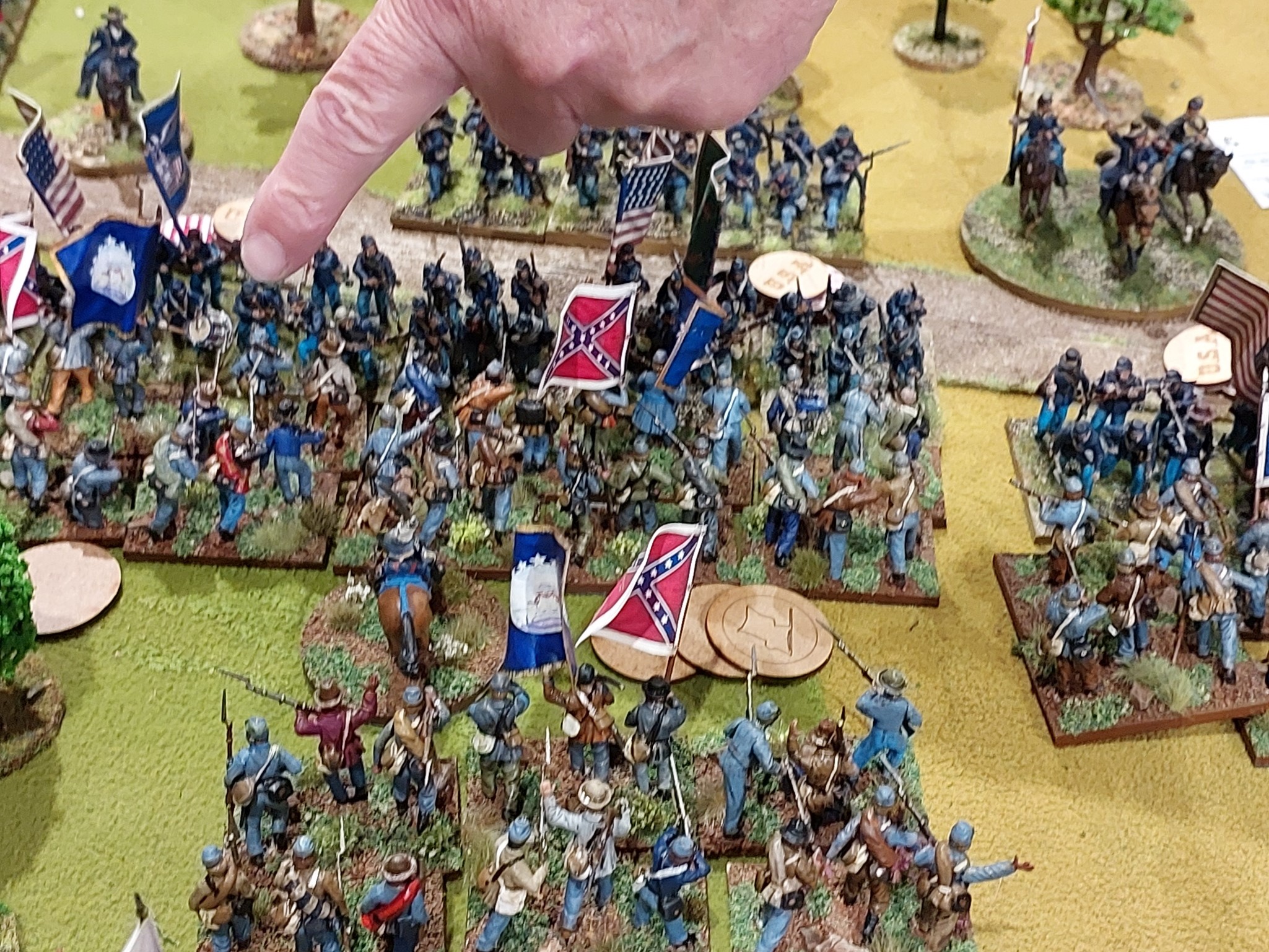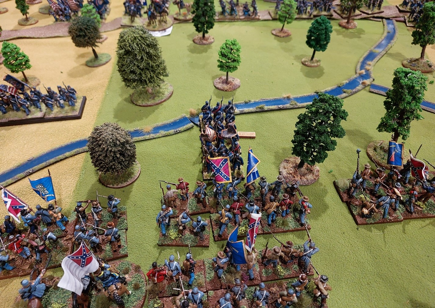 One of the Confederate players sadly had to leave early so Mike and Sheridan took over a neighboring brigade. Above is the center of the table where an outnumbered Confederate Mike is having a masterful game.