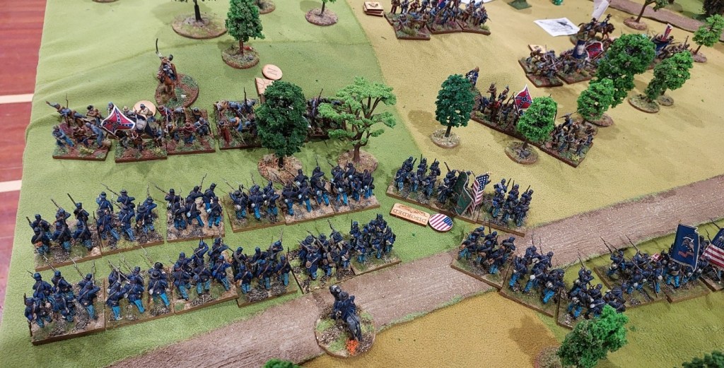 Goldie and I designed the game and we have 3 dismounted cavalry units arrive on turn 3 and move towards 3 division commander’s per side. Each had a different dice….one represented a reserve brigade arriving, the other 2 stragglers that recovered a casualty. The base I tagged as the Union brigade arrived in Keith’s space….while the Confederate brigade arrived….opposite them with Sheridan! Just as well as they were churning through regiments.