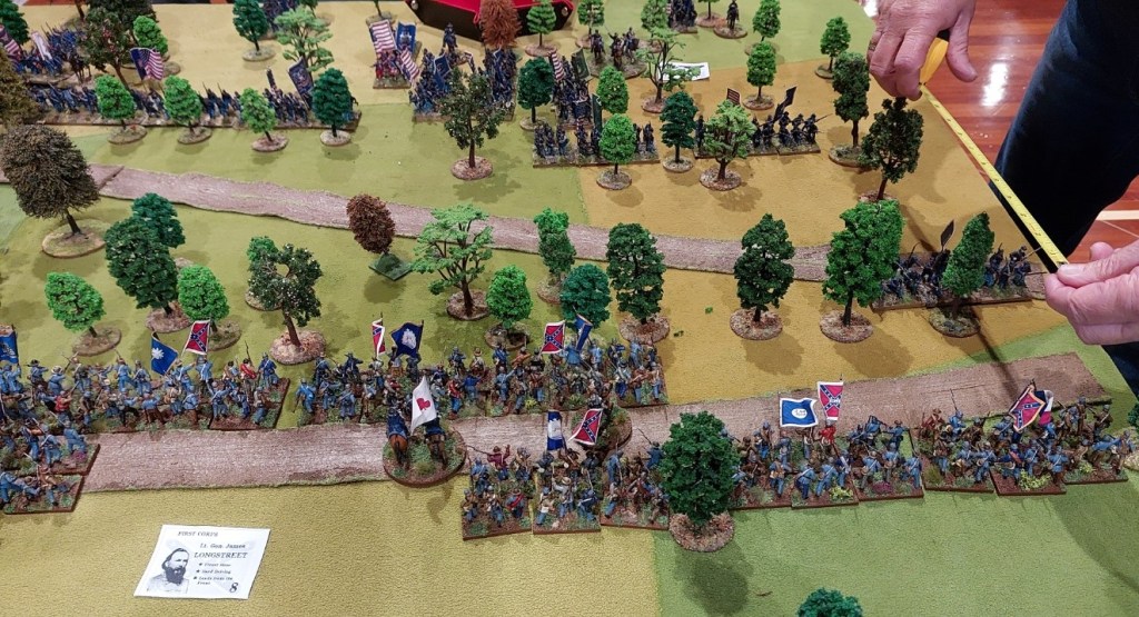 The game was on a 18ish foot long x 6 foot wide table and as one would expect for the Wilderness…there were a lot of trees. We had some designated clear areas where artillery could be deployed…somehow that morphed into you could unlimber and use guns on the tracks and shoot into the woods…..GGGRRRR. The Confederate side deployed up to 24 inches in from the table edge while the Union were marching on from their table edge. The Union had first move.
