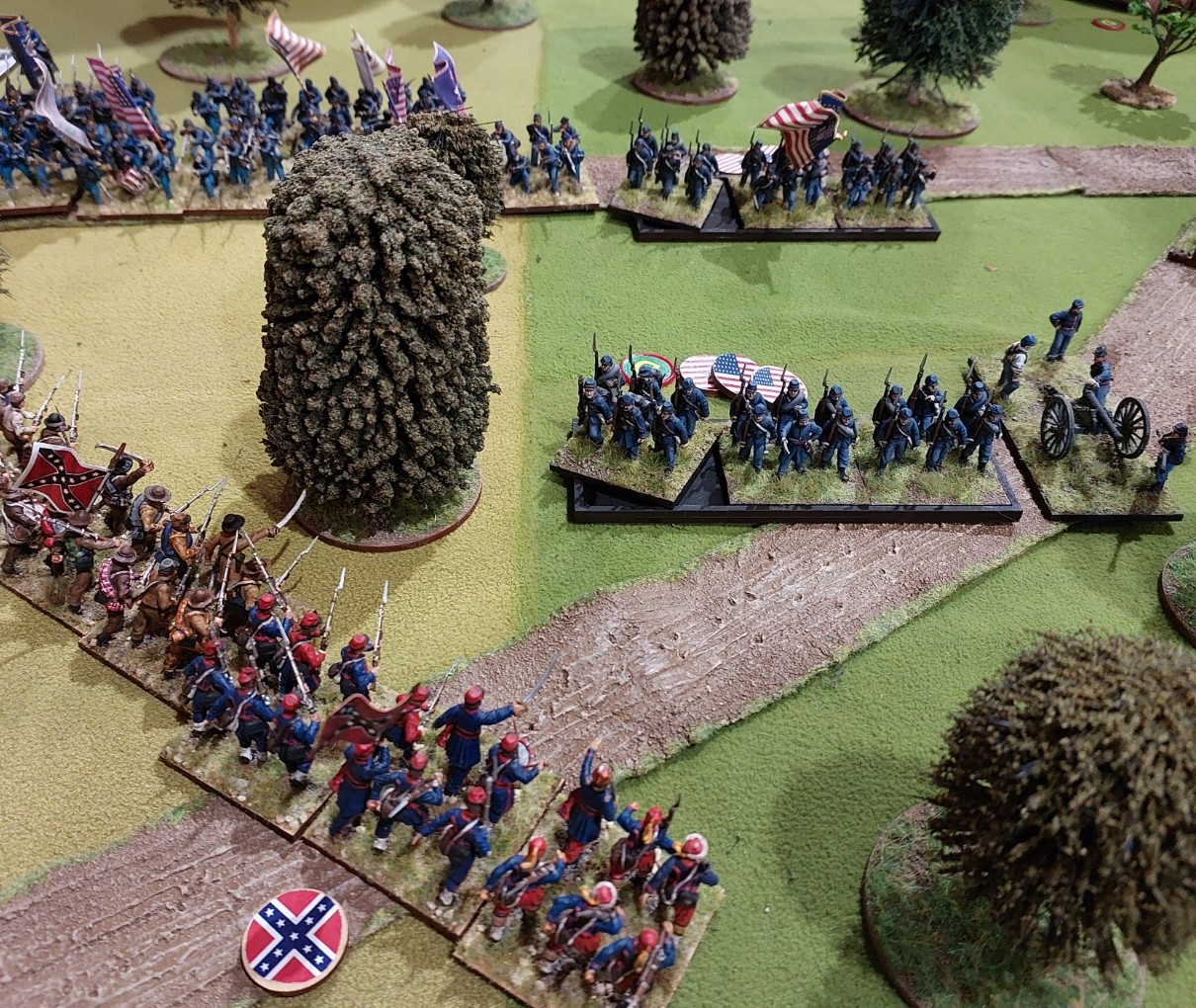 Rebels advance on disordered/shaken Union unit with a battery facing into the woods…grr. The rebels failed the charge order on this juicy target.