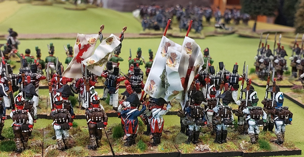 Dave is collecting Calpe Prussians so I invited Alan and Goldie along as they have Prussian Armies, Brian has Spanish so on the day Goldie(Calpe Prussian) and Dave(using Alans Perry Prussians) were Prussians, with Brian being Spanish and Alan used a Dutch/Belgian/Hanoverian force. I was on food, drink and rules!