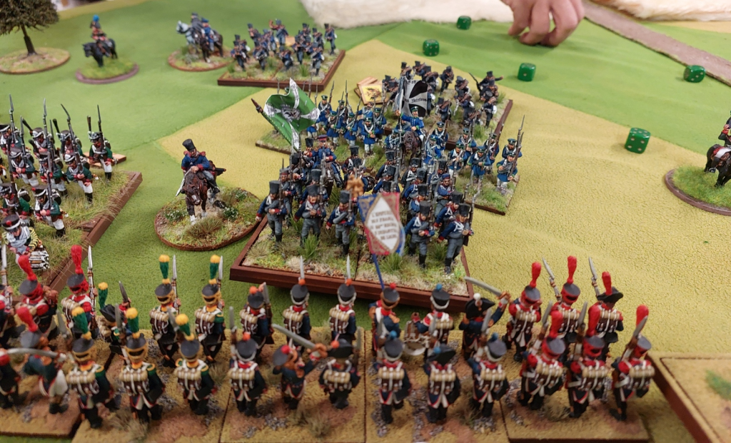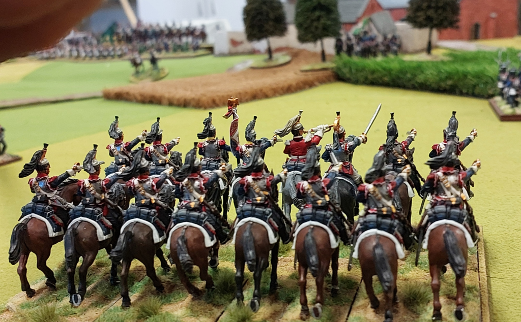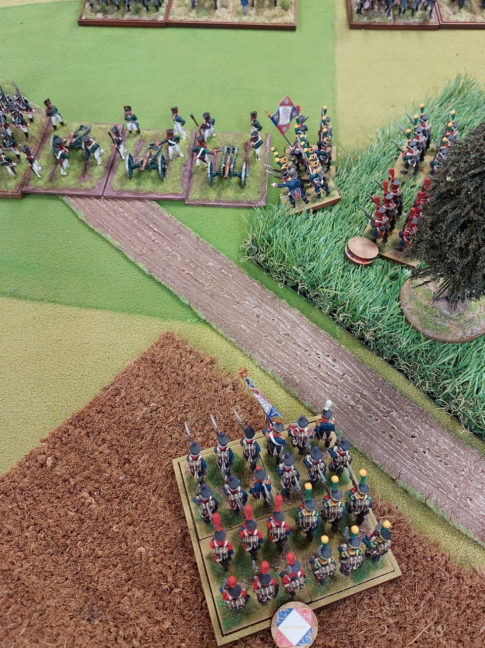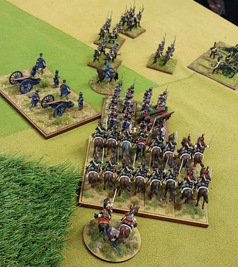 I confiscated the Cuirassier Division when it arrived and used it to do as much damage/distraction I could in the center. Would have preferred Uhlans but we had none. The -2 save on a lance attack against infantry is better than extra attacks on infantry in column who are saving on a 3+.