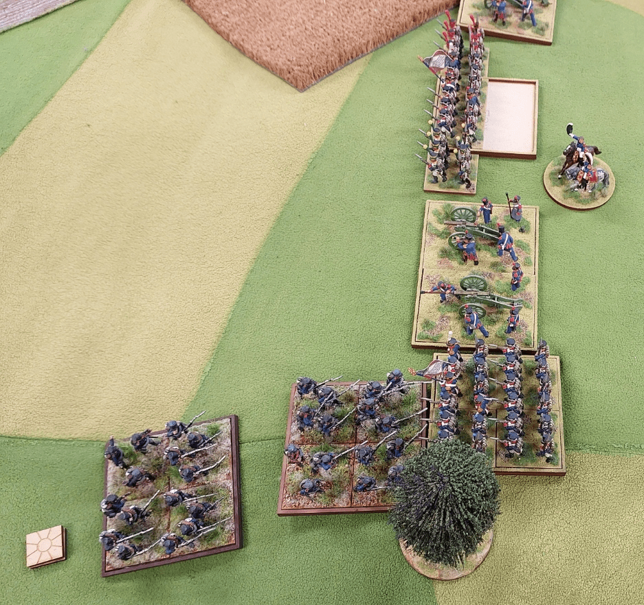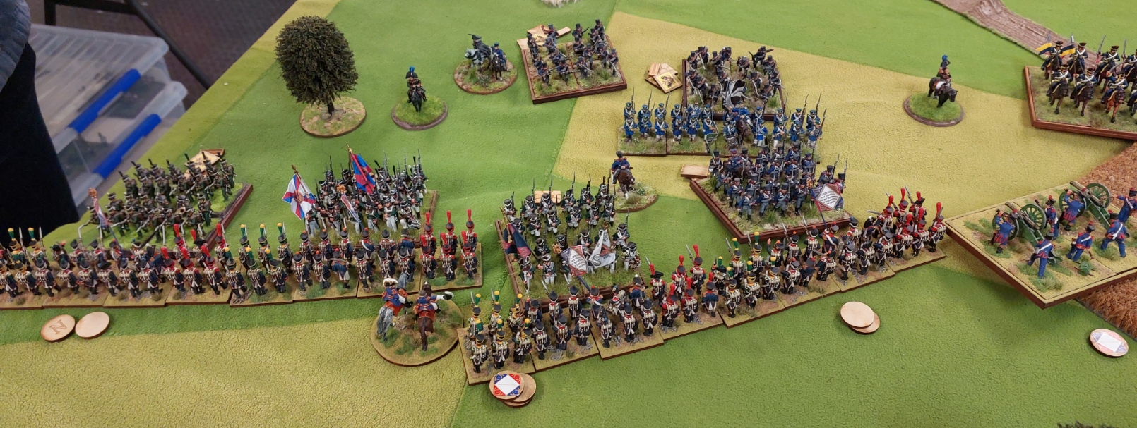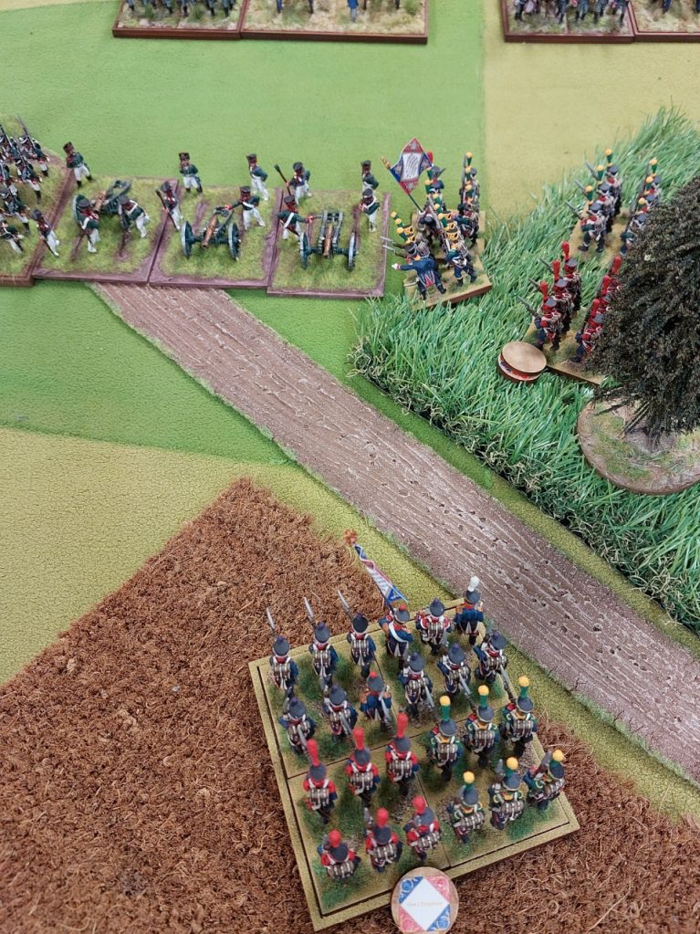 Start positions with the French on the right. Goldie has the left flank Division, Me(Terry) the Village with a Division and Rob the right Division. The 2 Young Guard batteries are in Goldies force.