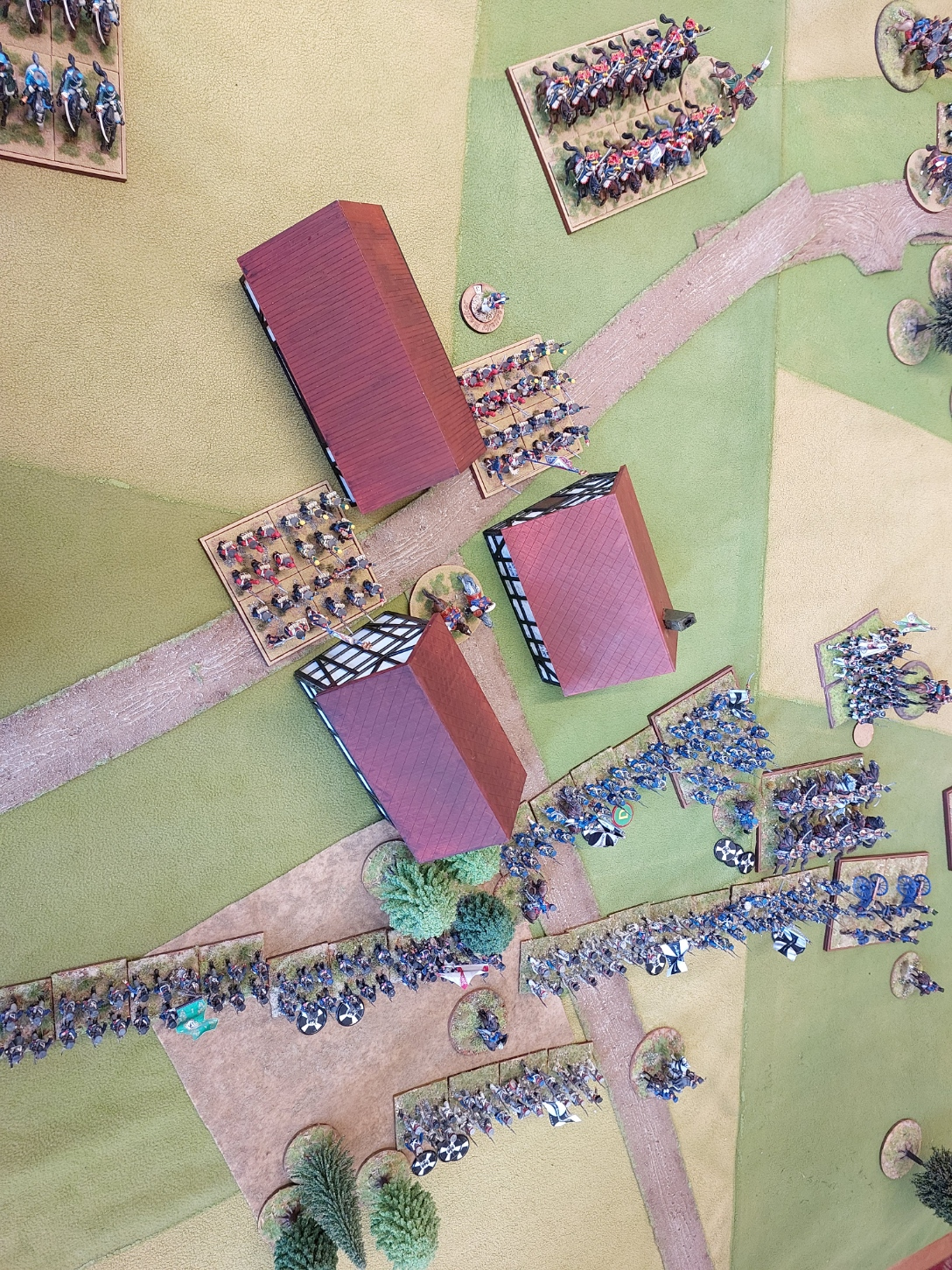 The game was fun but did have some issues. The Buildings I used are just to big so I have commissioned Alan to find some C18th French building of smaller size he can print which would be suitable for our Napoleonic and FrancoPrussian games. This morning he has sent me pictures of some which I will get him to print and be used for a garage resource. Also the players mistook the fields in front of Paundsdorf and Sellerhausen as woods…they were fields with only the gardens at Schonefeld being treated as terrain.