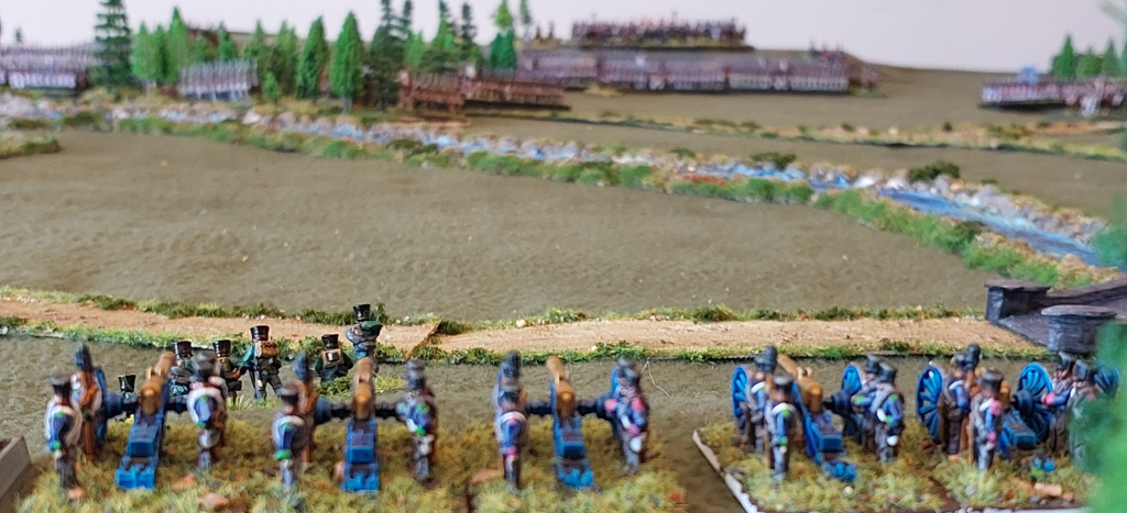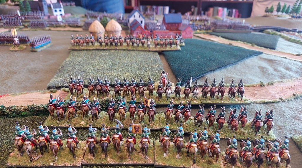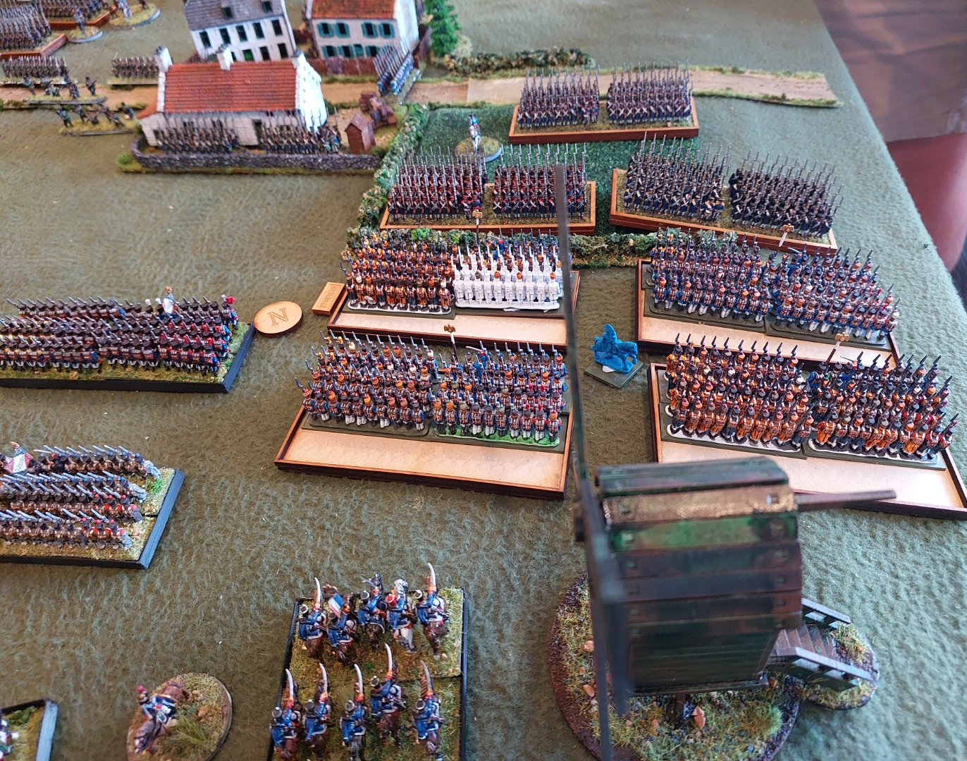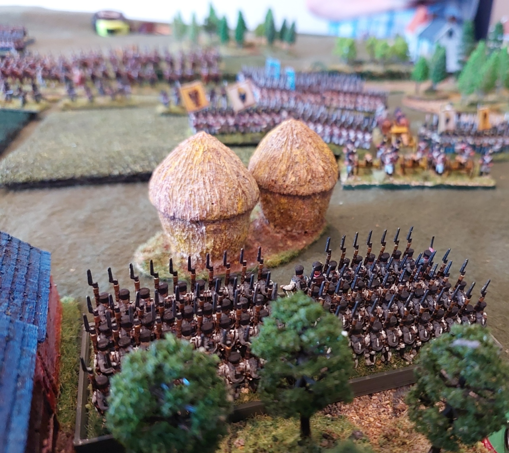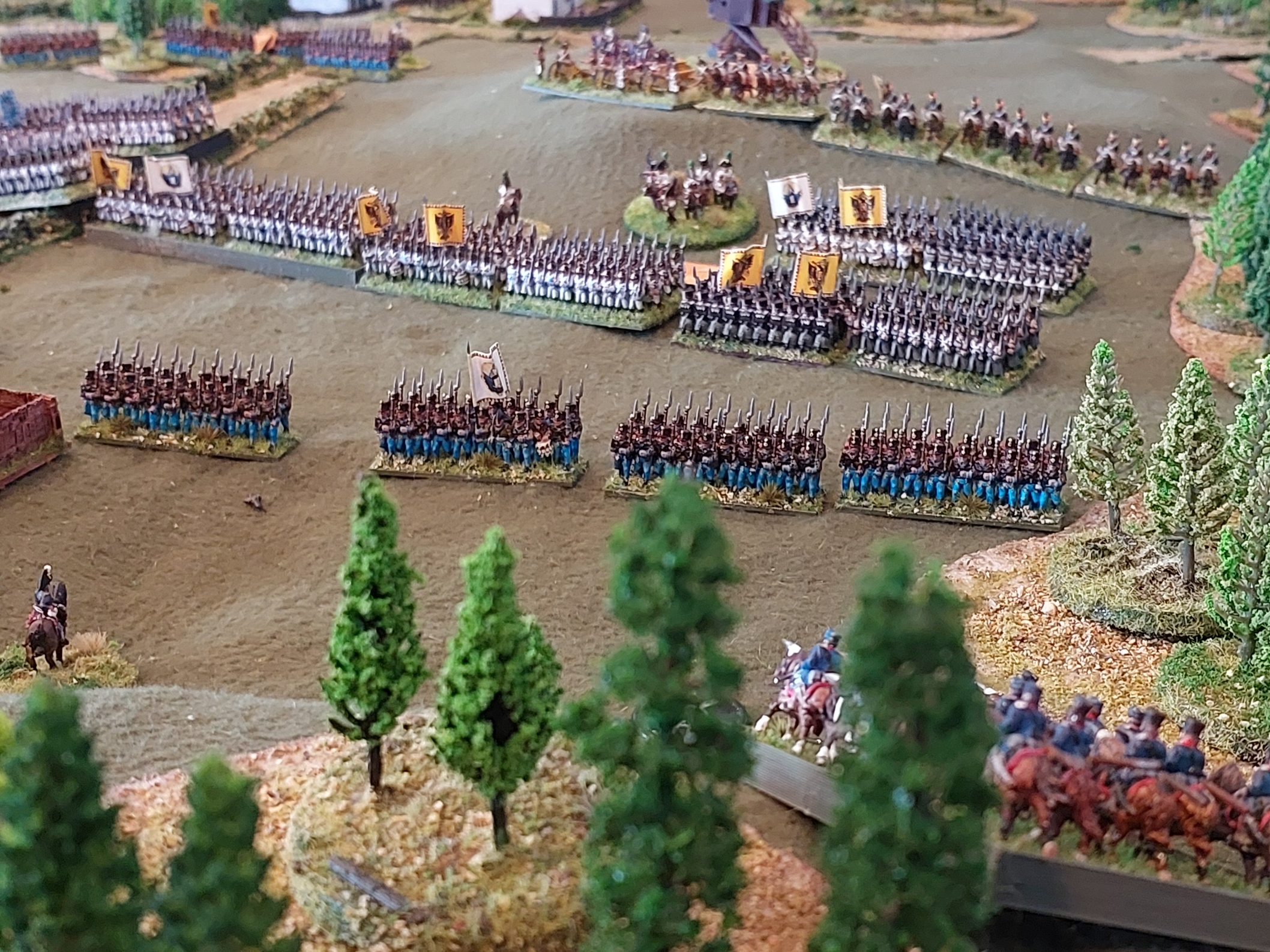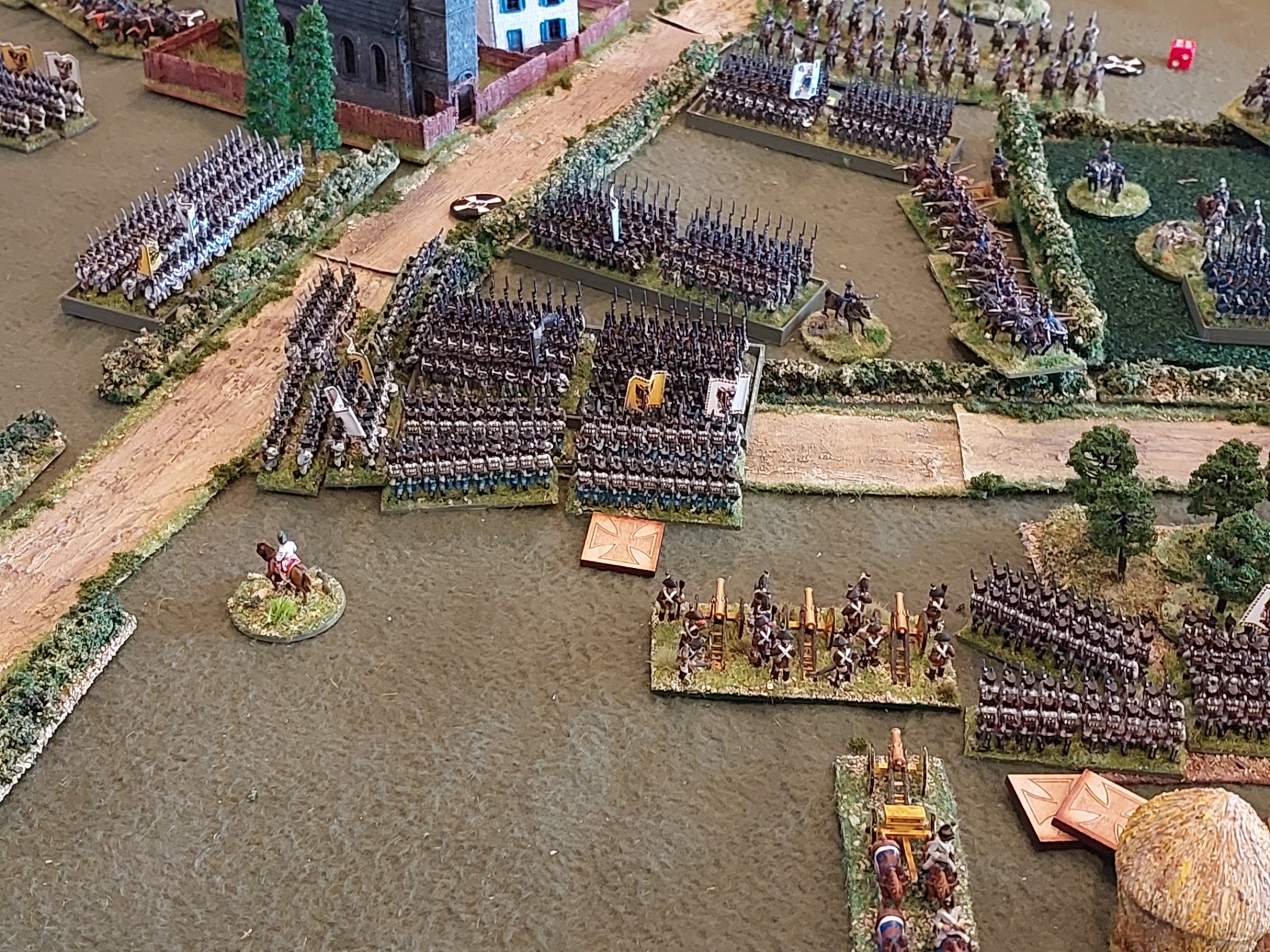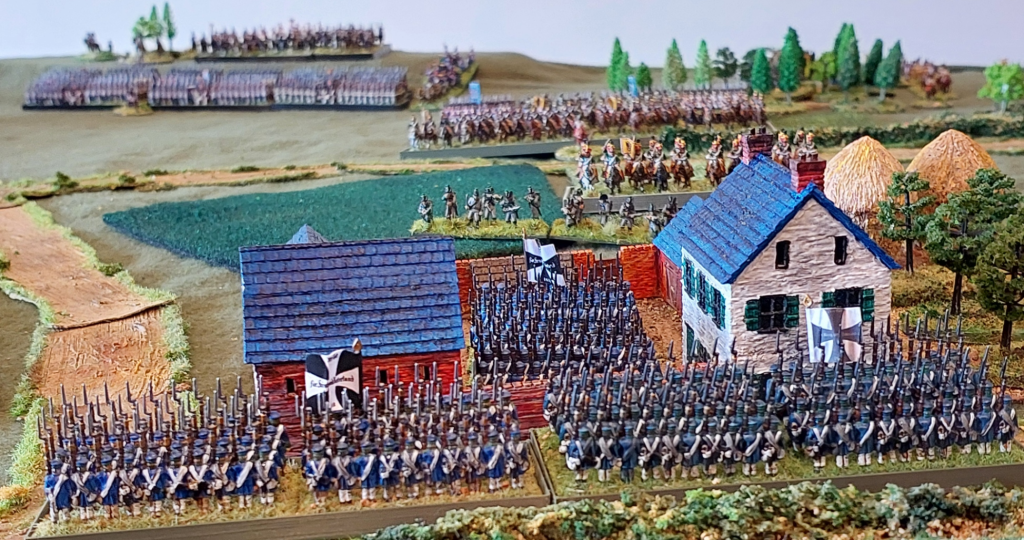 Right Prussian flank…columns supported by cavalry….horse battery in front line beside farmhouse.