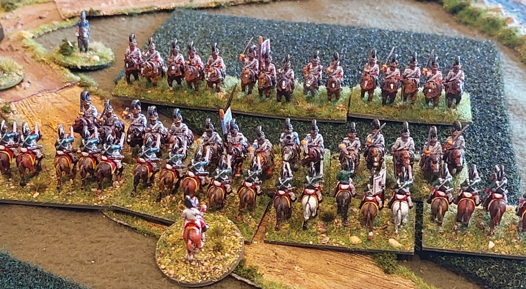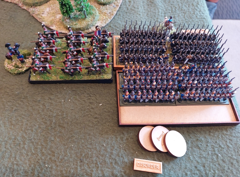 An ouch moment…Austrian Cuirassiers charging Austrian light cavalry…Austrians have 9 dice…hit on 3s…save on 3s….add D3 to combat and have a support…so a +1 on result. Austrians are a large unit so 8 attacks…hit on 3s…save on 4s…no supports….but commnader added to combat…so 9 attacks now…still lose!