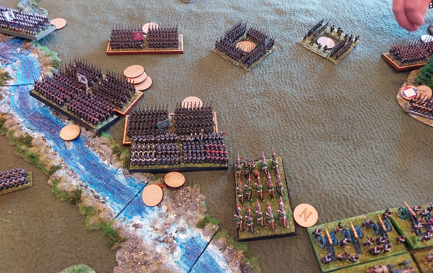 Over on French right……French have won the 2 combats from above….then hit the flank of the Prussian Guards who have been destroyed. Stephen and I have both lost a brigade so looks like a draw here.