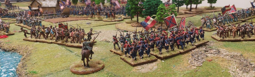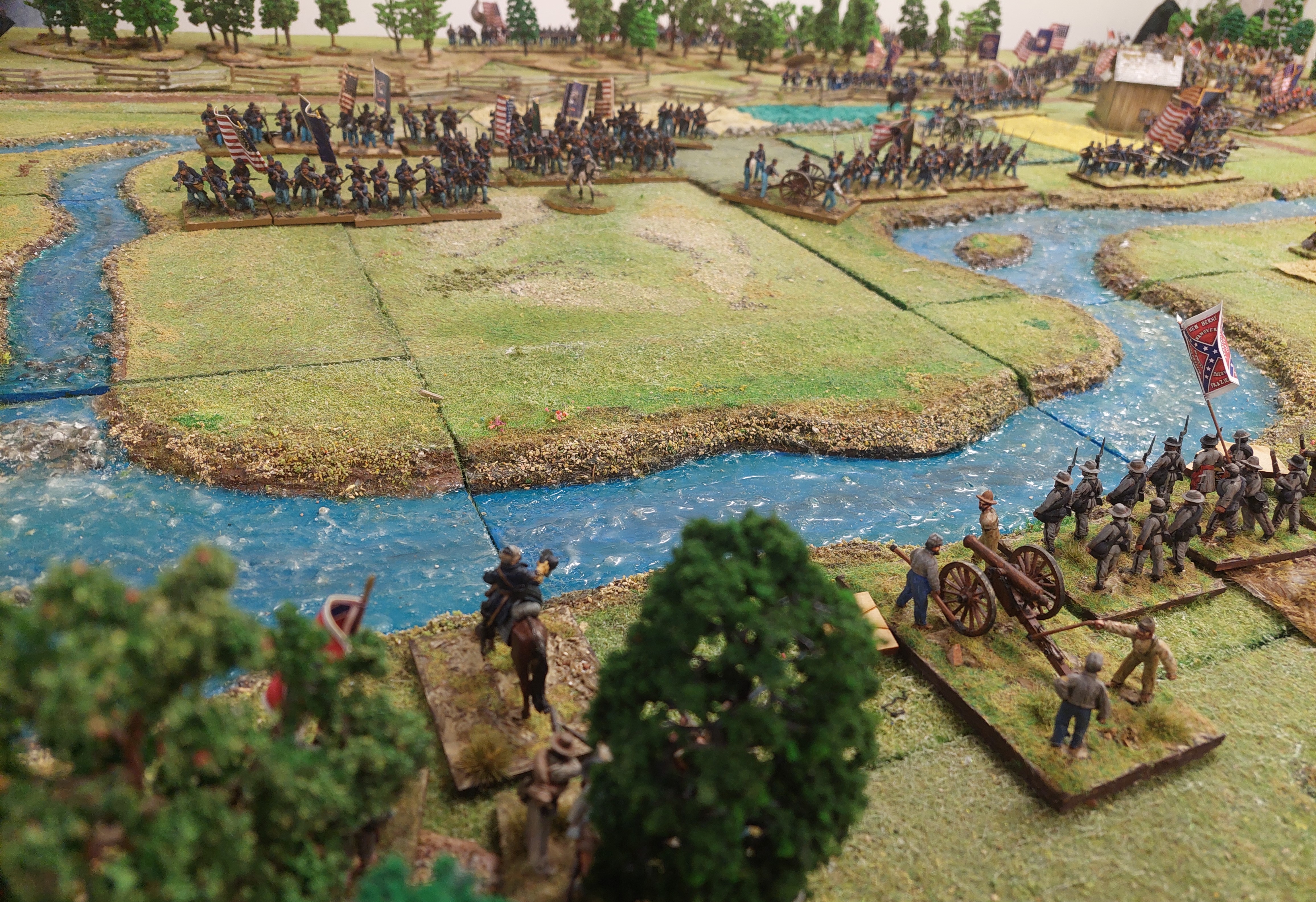 The Union cavalry have been beaten after several rounds of hand to hand and mount up and ride away….those that could. Just to the left of the field the Confederate Division of John Gordon has commenced crossing the ford. Goldie had arrived and took the brigade of Evans and his 7 Georgia regts. Keith retired the cavalry and took command of the 2nd brigade of Hays 5 Louisiana regts.