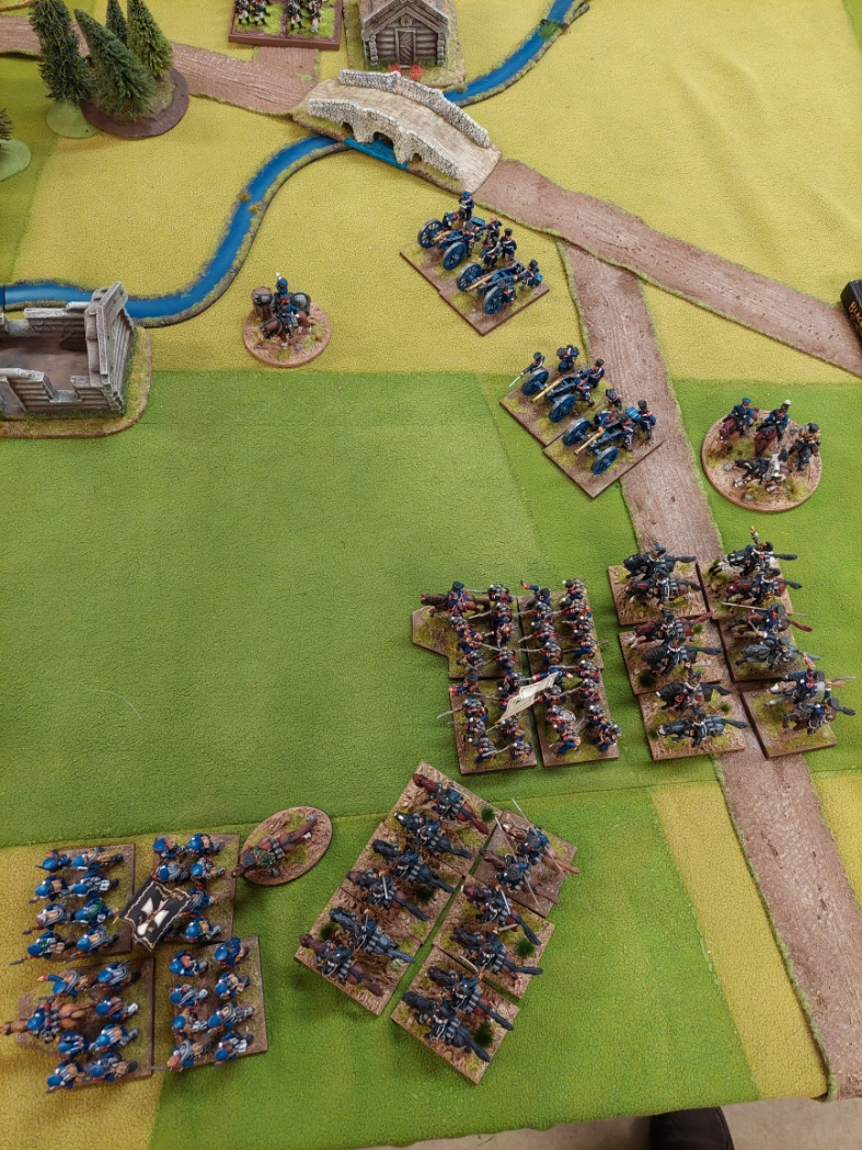 To the south the Union cavalry of Clendenin commanded by Rob had 2 dismounted regts covering the ford with 2 more on there way. Across the ford can be seen the lead regts of McClauslands cavalry brigade of 4 regts commanded by Keith.