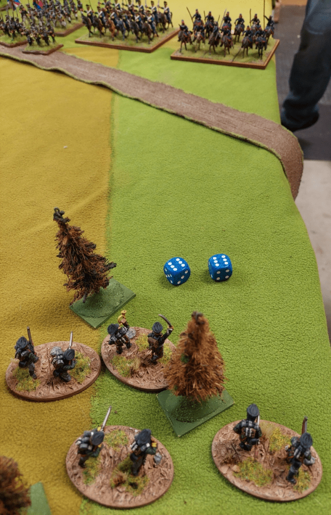 Here is Reg having deployed…..Goldie got some good shooting in. Alan’s dismounted cavalry hanging around as well.