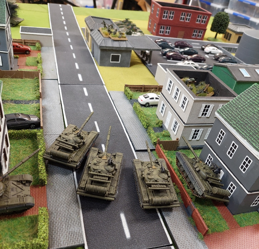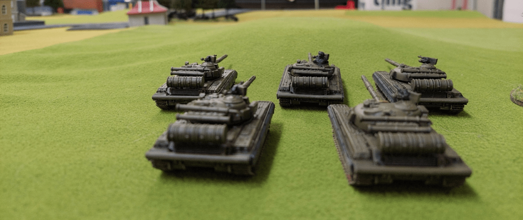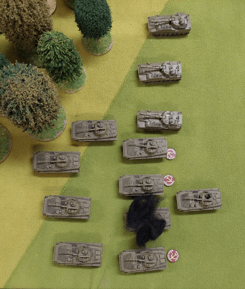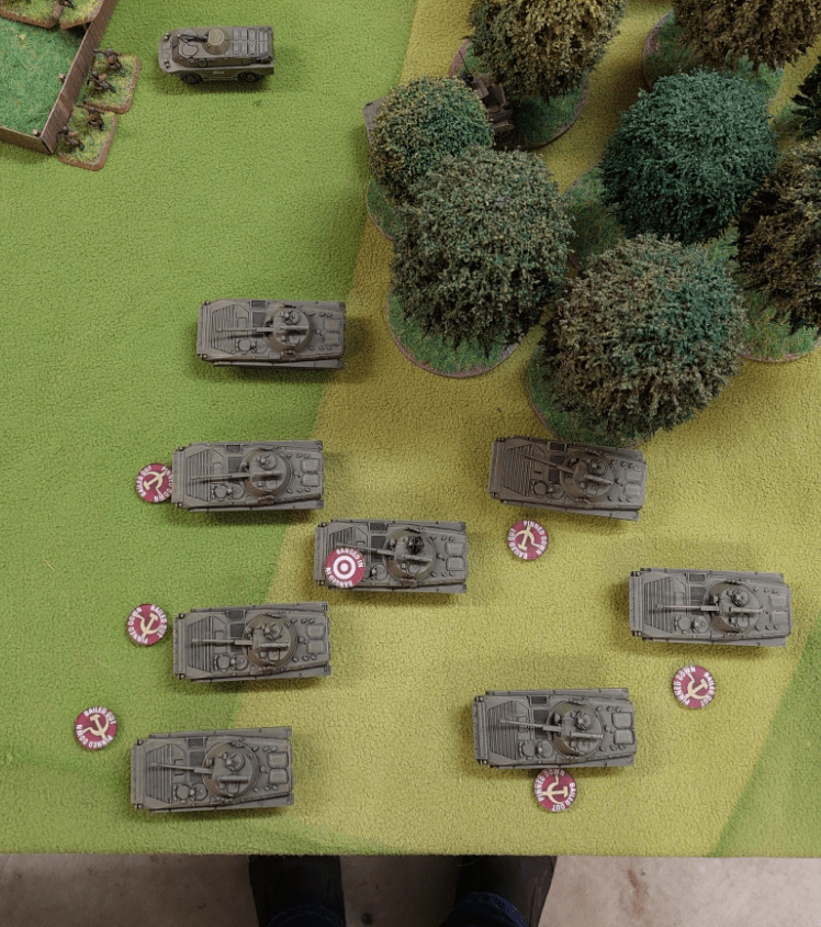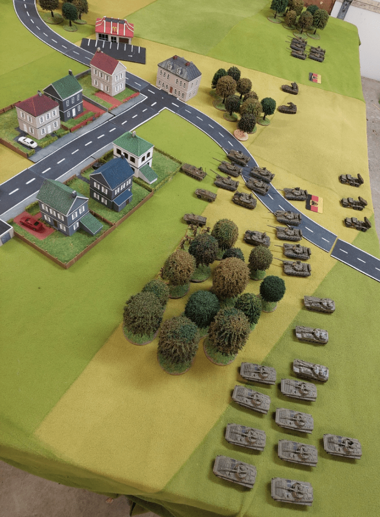 Goldie set up from left to right with BMPs/Carnations on left…..infantry in front of woods with armoured cars, in the centre 2 units of tanks with AA quad guns in support and rockets to rear with on the right AA rockets and another units of tanks.