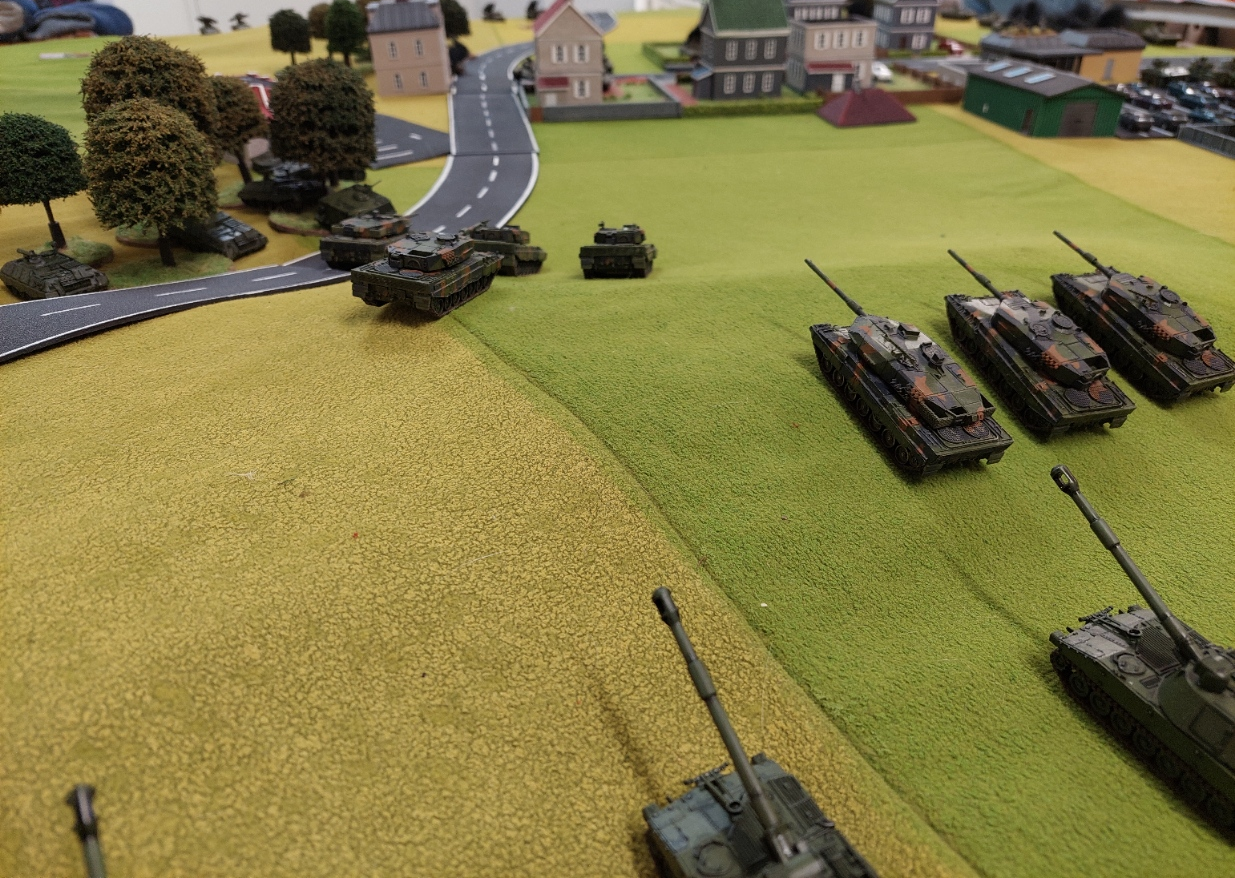 In my set up below I had from my left to right…..4 leopard 2s including command tank….3 Jaguar’s…3 M109s with M113 spotter and then 3 more Leopard 2’s. On my right were 2 Luch’s recon and 3 Marder’s with Pz Grenadiers in them. Loose plan was to occupy buildings on right with PzGrs..hide the 5 vehicles until targets within 20inches of them and to use the M109’s and Milans/RPGs and Carl Gustav plus Mg’s to keep Goldie at Bay. Then in centre and the left use the firepower and advantage in range of the Leopards with the M109’s, Jaguar’s and Luch’s supporting.
