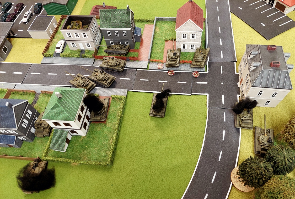 I won turn 1 and let rip at the BMPs with my M109’s. They have been the stars of previous games……however Paul discovered his save rolling dice and they ran hot! Managed blow up 1 and 3 bailed out…they passed morale saves next turn and hoped back in.