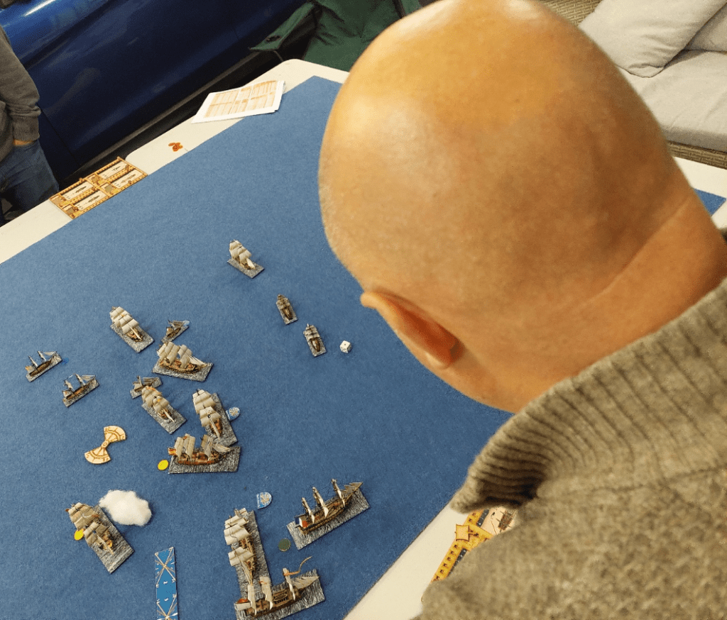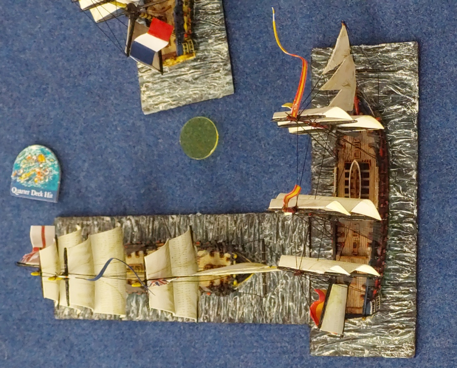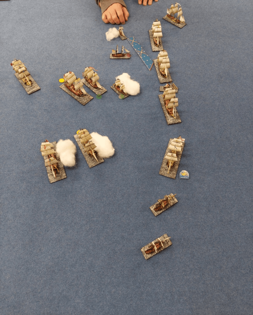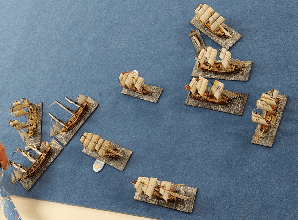 Final despairing turn of the F/S as they fail to escape. These sail games involve lots of dice being rolled…very nice wee models…the randomness of wind changes really stuffing up a plan……makes for a fun game in an evening.