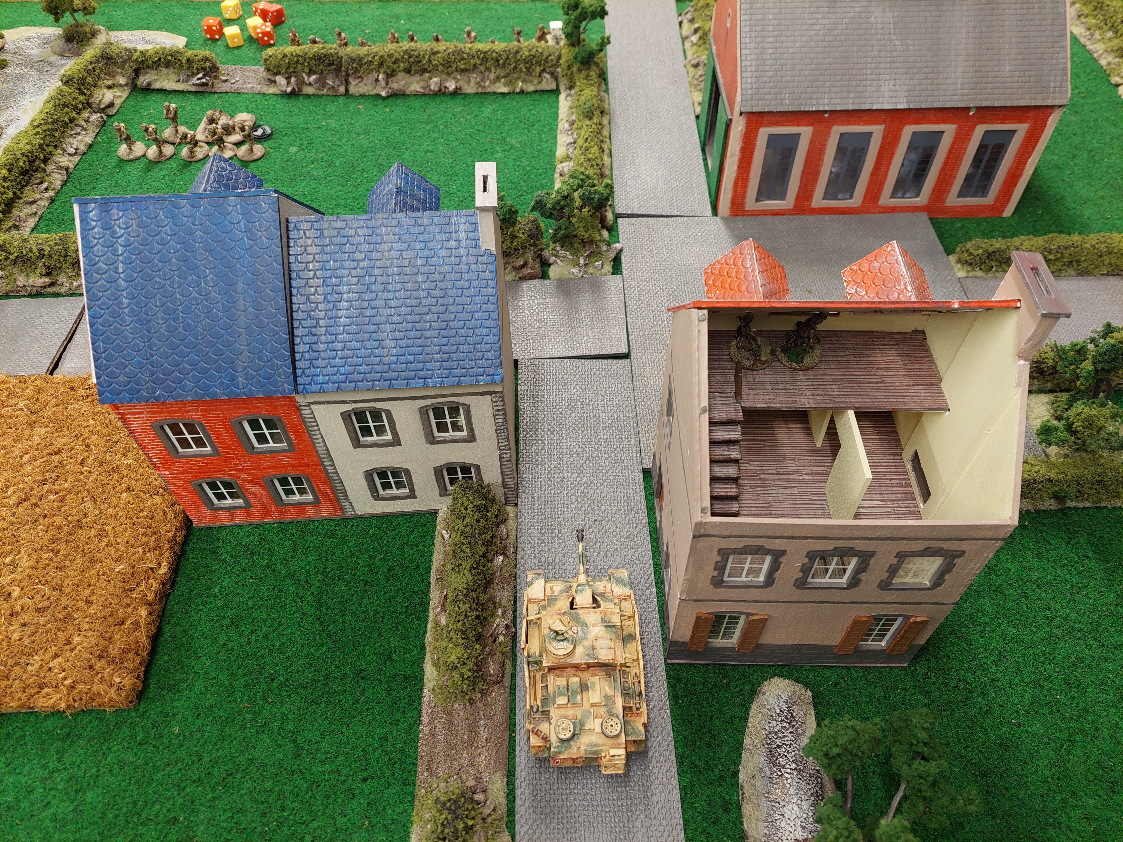 My high water moment…well really my only moment to be honest. I dropped a mortar shot on top of it…had to throw lots of 6s…and did. That was fun, I like throwing lots of dice! Unfortunately when rolled for the bazooka team on it…rollled a 1 so they escaped…darn it.