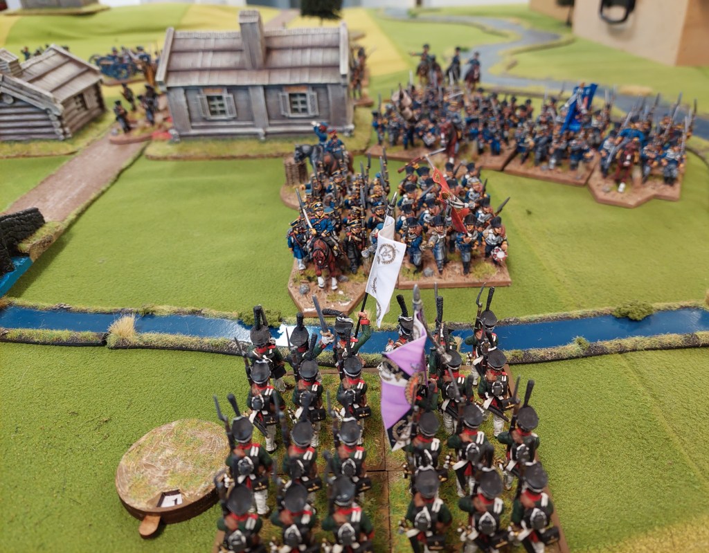 So below we have the set up. My Russians are on the left and are attacking across a stream with Murray defending a lone of 2 villages with a wood in between. His reserves are advancing from the left baseline. I am using my Grenadiers but they are playing as standard Musketeers.