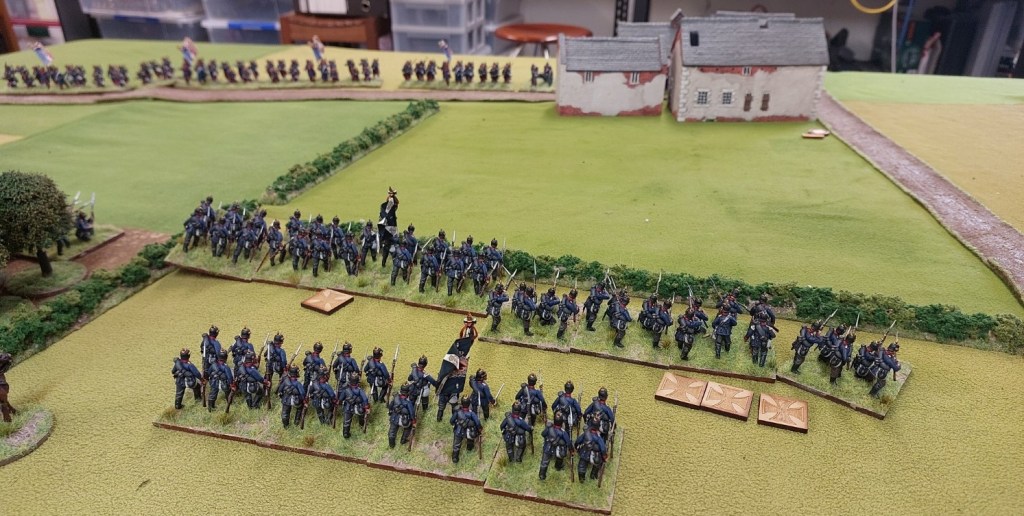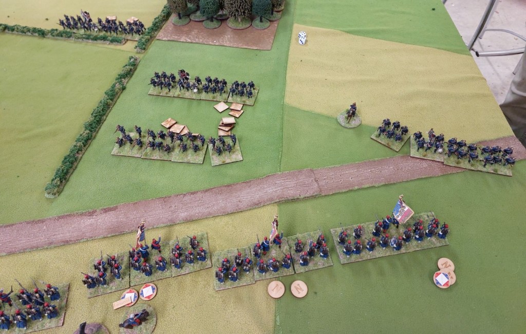 The French left and center…..I have managed to move and am dishing out damage. Beside me in the center Robert outnumbers the Prusso/Bavarians facing him but is not making any headway.