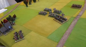 So below we have the set up. My Russians are on the left and are attacking across a stream with Murray defending a lone of 2 villages with a wood in between. His reserves are advancing from the left baseline. I am using my Grenadiers but they are playing as standard Musketeers.