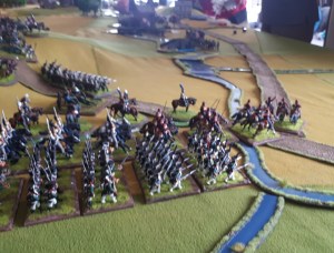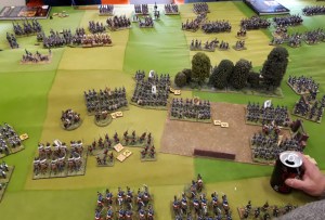 An after battle shot…the battle photo was a failure unfortunately. A unit Russian Hussars charged the column that had been shaken/disordered by gunfire in previous turn. It formed square, the Hussars charged in….inflicted 5 casualties, already being shaken and disordered, it popped. The Hussars then did a sweeping advance into the small line unit, it popped. Break tested resulted in others popping or running. Brigade was broken!