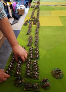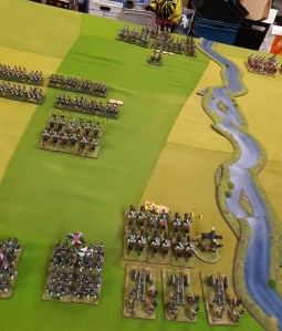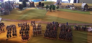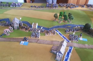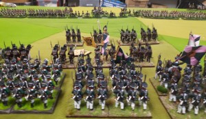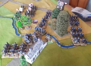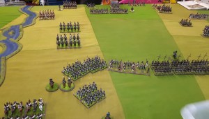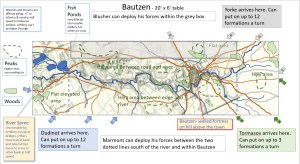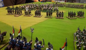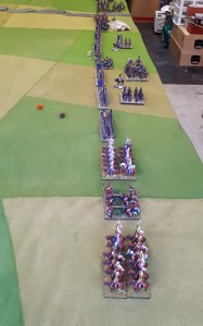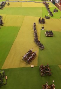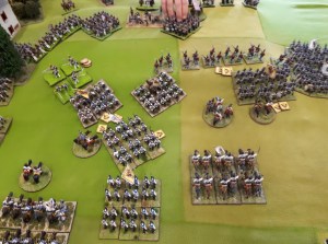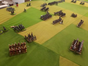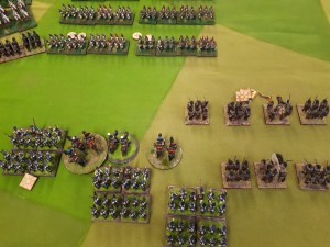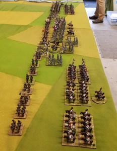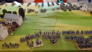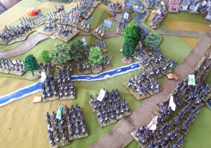 Starting with the attacker, both players nominate half (rounded up) of their brigades to be placed into reserve. Starting on their 2nd turn, players will bring on one brigade per turn through the assigned area of their table edge. Units arriving from reserve make one normal move, measuring from the edge of the table. Charges, multiple and special moves, are not allowed. Troops arriving from reserve may shoot as normal after making a single standard move. All units must enter the table from a length of table edge equal to the diameter of their commander’s command diameter (i.e., we imagine that they were under command as they march to the table. They may move freely after that point as desired. Units may be in any legal formation with the exception of artillery, which must enter limbered.