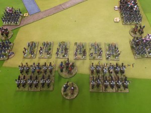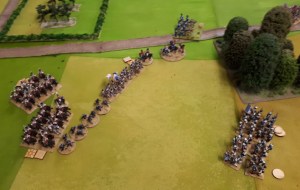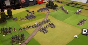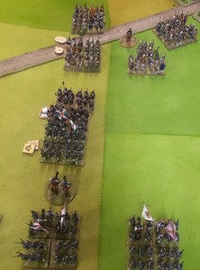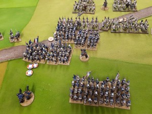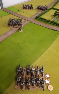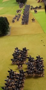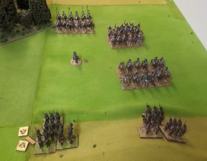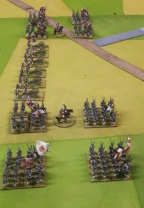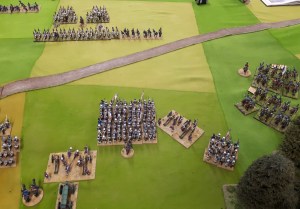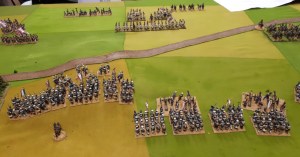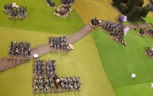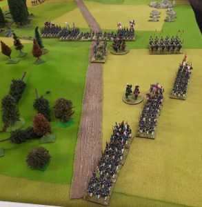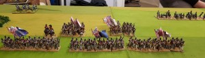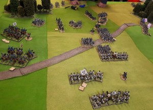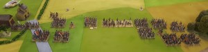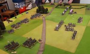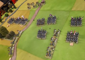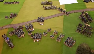 Starting with the attacker, both players nominate half (rounded up) of their brigades to be placed into reserve. Starting on their 2nd turn, players will bring on one brigade per turn through the assigned area of their table edge. Units arriving from reserve make one normal move, measuring from the edge of the table. Charges, multiple and special moves, are not allowed. Troops arriving from reserve may shoot as normal after making a single standard move. All units must enter the table from a length of table edge equal to the diameter of their commander’s command diameter (i.e., we imagine that they were under command as they march to the table. They may move freely after that point as desired. Units may be in any legal formation with the exception of artillery, which must enter limbered.