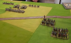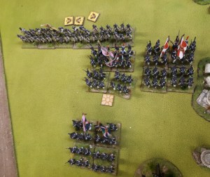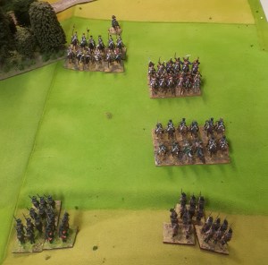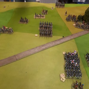 An after battle shot…the battle photo was a failure unfortunately. A unit Russian Hussars charged the column that had been shaken/disordered by gunfire in previous turn. It formed square, the Hussars charged in….inflicted 5 casualties, already being shaken and disordered, it popped. The Hussars then did a sweeping advance into the small line unit, it popped. Break tested resulted in others popping or running. Brigade was broken!