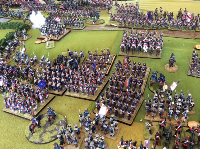 At 10 past 2, a fellow every bit as flamboyant at the King of Naples, with a tiger skin saddle cloth decides to lead the English Household Cavalry in a charge to throw back the Cuirassiers who are hypnotising the English Foot. The cuirassiers dig in their spurs and meet the Aristocrat’s sons head on. It is not a contest. The scions of the peerage are destroyed and their popinjay Commander is amongst their dead. I am informed this is the, till now, vaunted Uxbridge. The English will need a new commander of their cavalry.