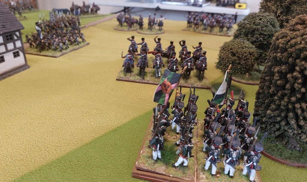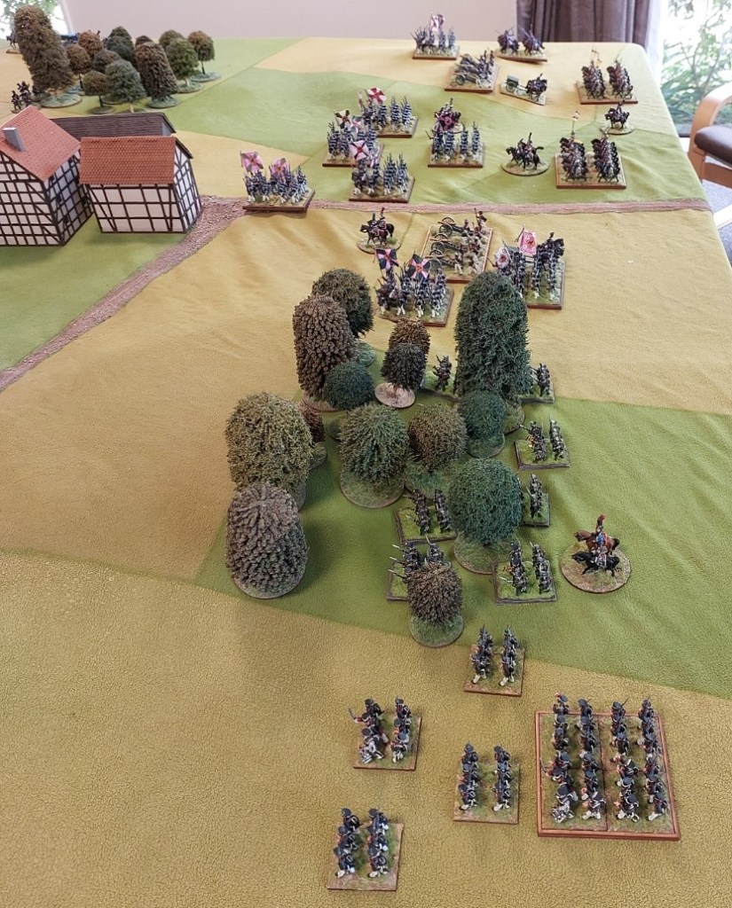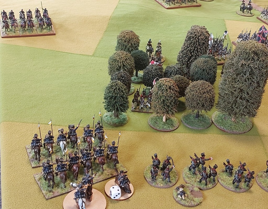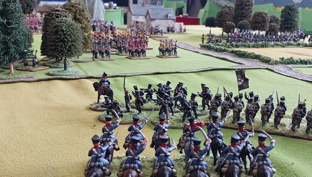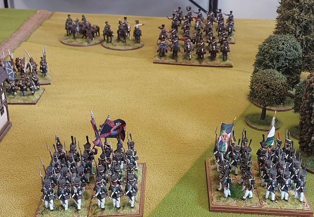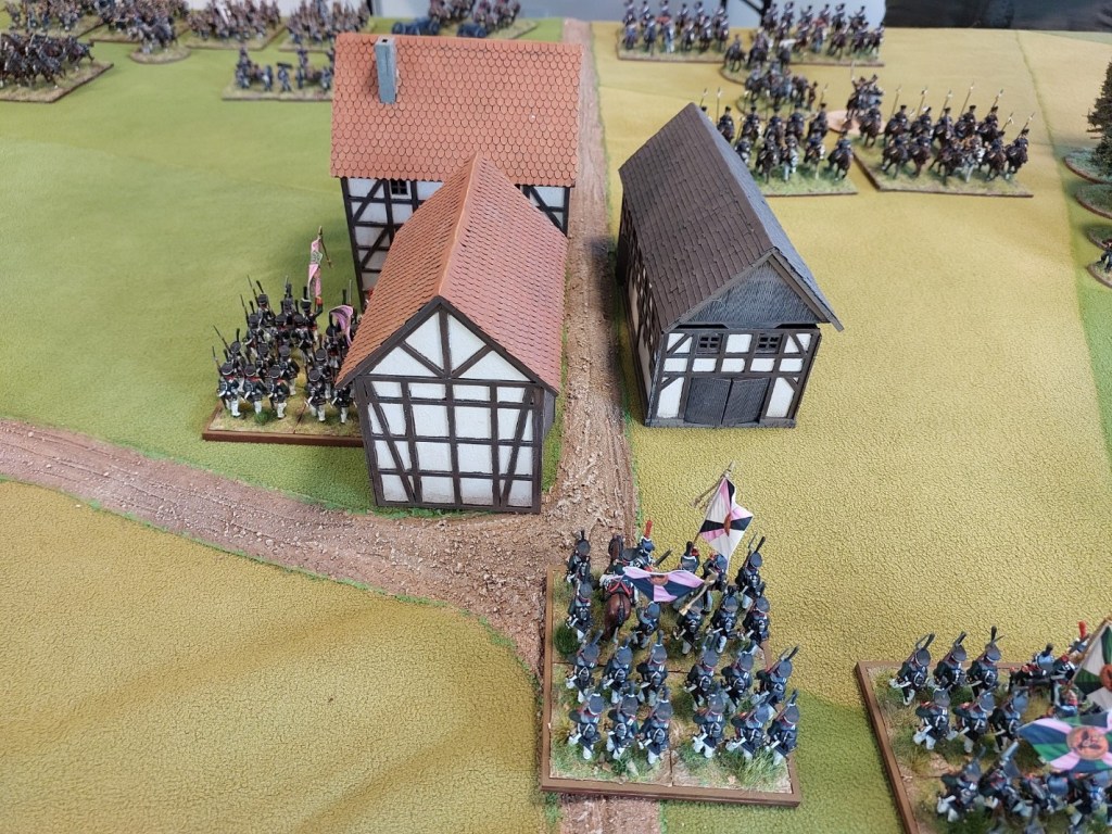 The undamaged Dragoon unit charged a column I had advanced to the edge of the woods who passed their test to form square and the Dragoons retired. With no artillery on this flank and infantry busy attacking the village…there was no risk to them….there were Prussian Jager in the wood…but they had been forced out.
