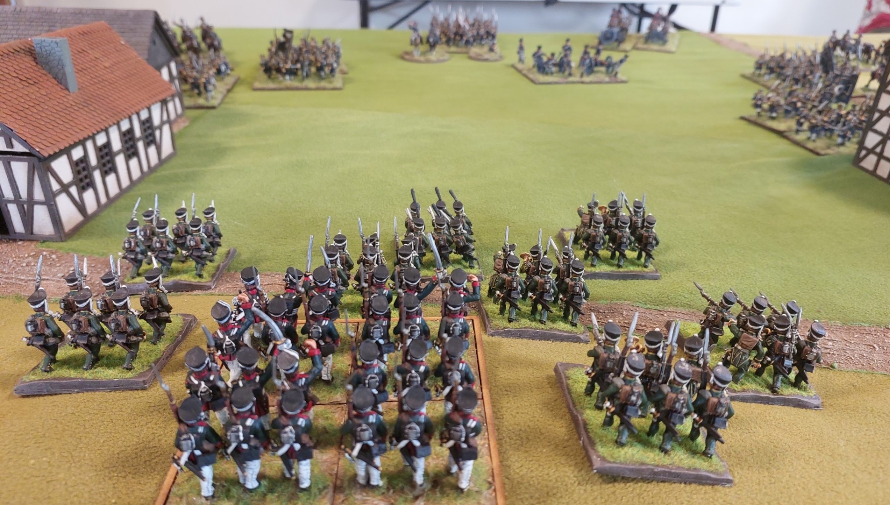 I did this so they were not available to charge me when I moved my Jager’s in skirmish formation through the open terrain between the farmhouse and Village.