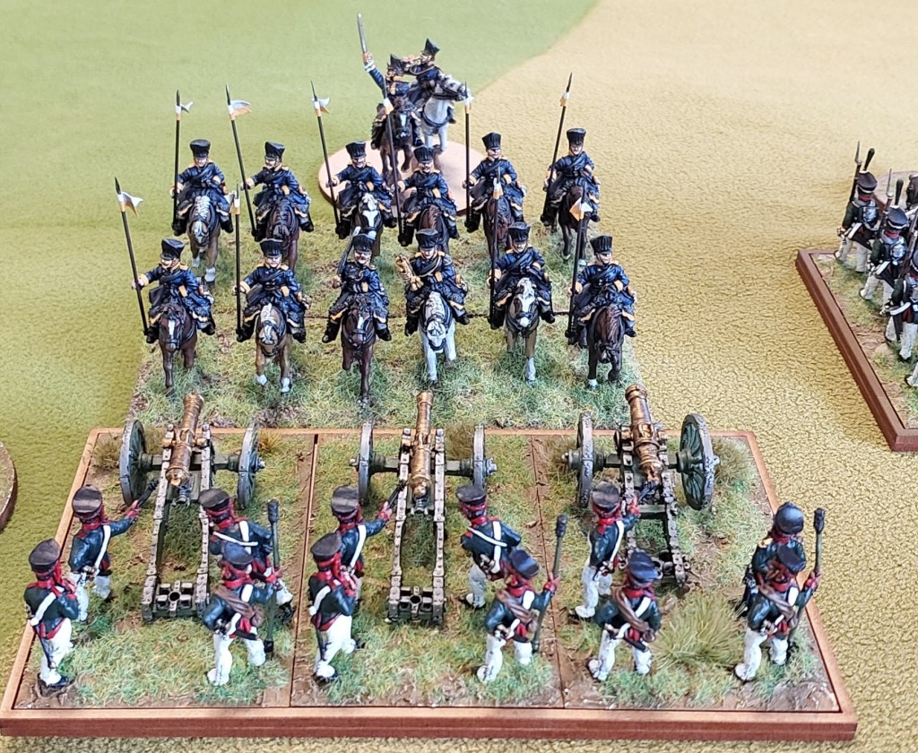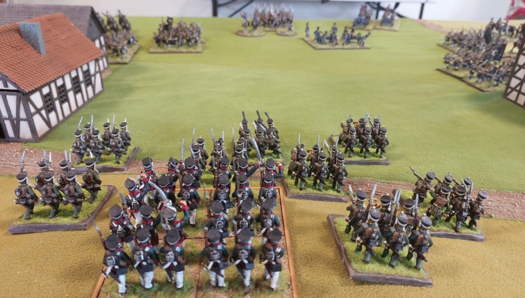 Skirmishing Russian Jager have advanced on Prussian battery and shaken it from shooting. Hussars are now positioning for charge on Prussian landwehr column next turn…which will form square…the Hussars will retire and the Column with then charge the now formed square. If they don’t manage to get charges in…there is a battery positioned to damage the column and 2 Jager units will be positioned to shoot it.