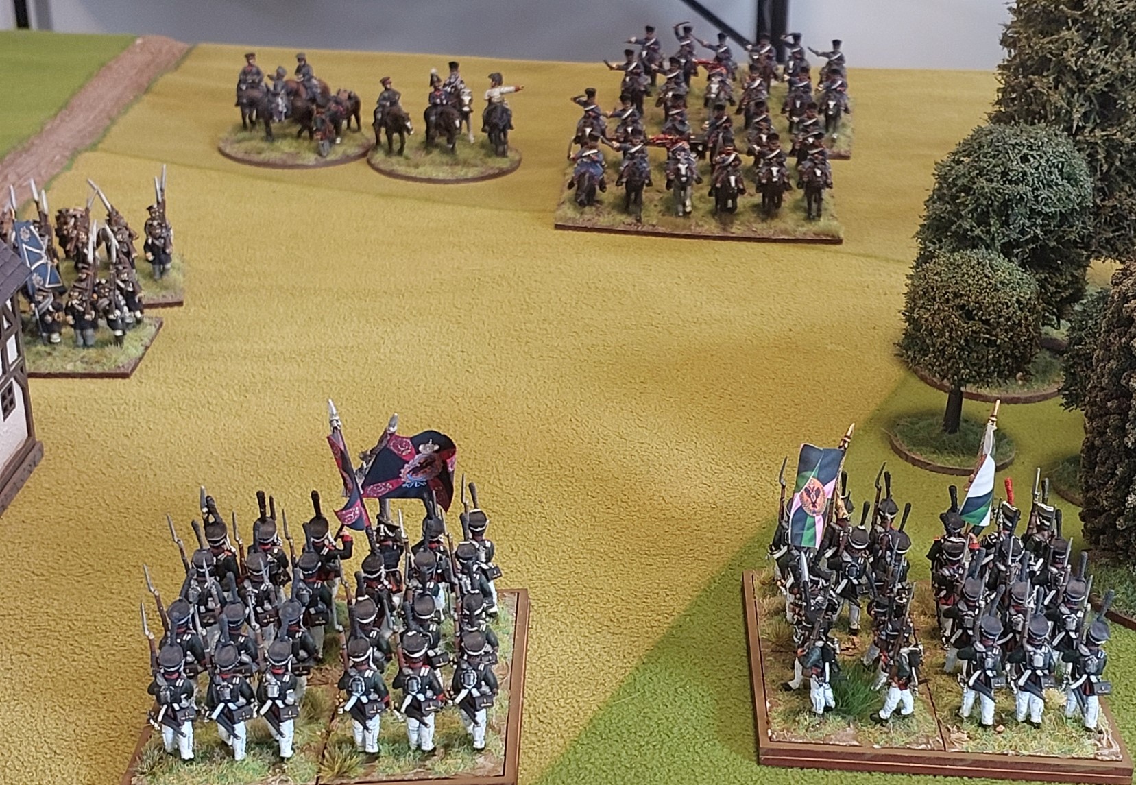 Fought on a 6’ by 9’ table. French deploy 30” in. Prussian Guards move on the right, Saxons on the left. The terrain is flat and open, with two sprawling villages and a few small woods.