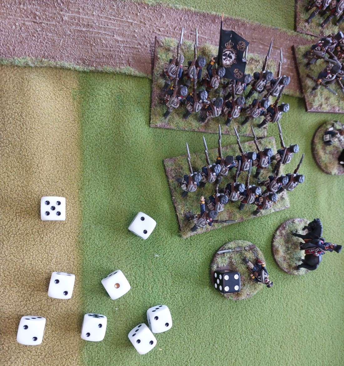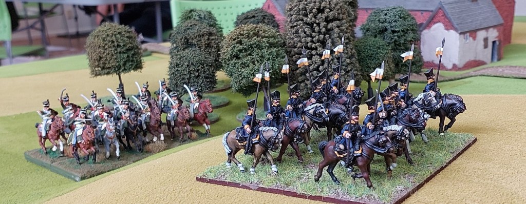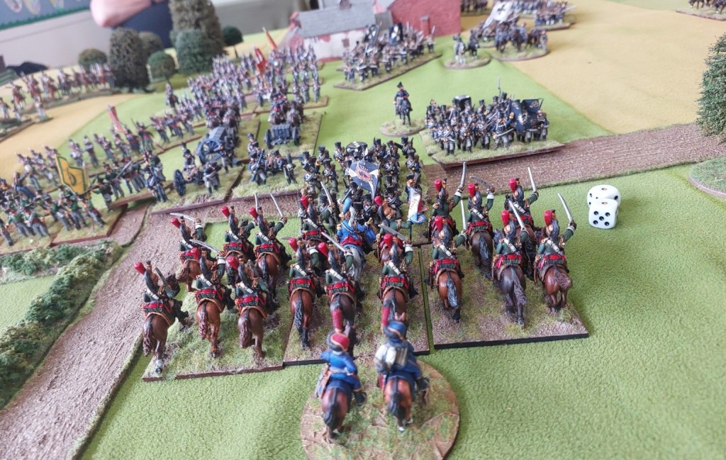 Prussian Cuirassiers take on French Guard Lancers….the Lancers are destroyed. Russ replaced his dice.