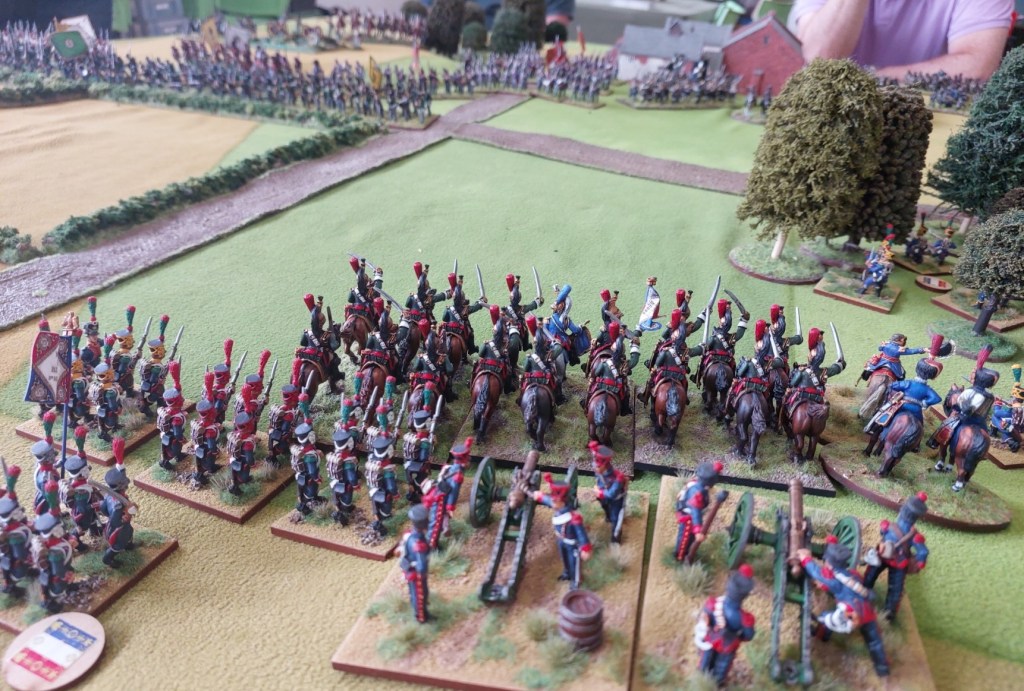A bit further on…and…no French Guard cavalry……Russ replaced his dice a couple of times…..there are 8 Allied Cuirassier units over here…and 3 pointy stick units.