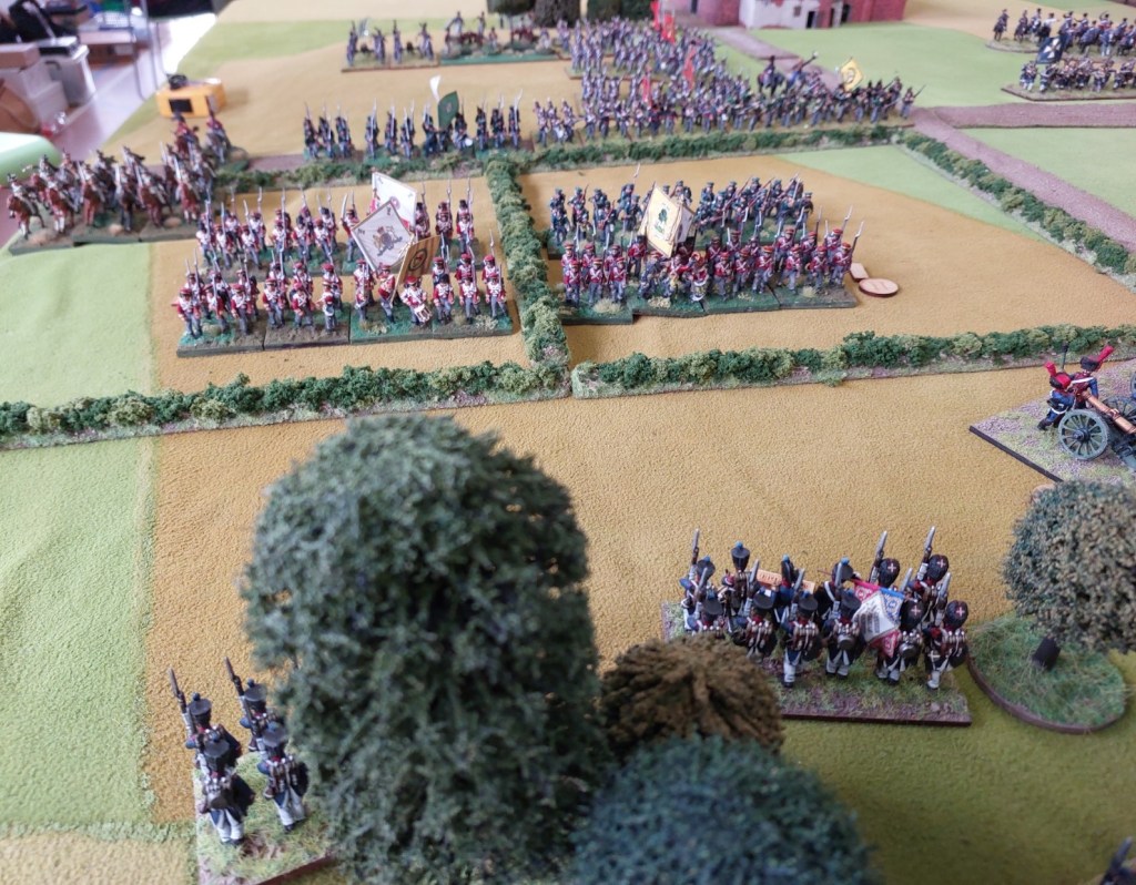 In centre PaulW who was over from Vanuatu had his reserve cavalry arrive on table…6 Russian Cuirassiers, 4 Guard infantry and 4 recalcitrant Grenadier bttns who refused for several turns to arrive. I suspect in protest at Paul leading them and not me…I am their normal commander. In front of them are Alans Prussians advancing in line…yes line…its 1813….I didn’t think Prussians knew what a line was then…..its a COLUMN Alan…a COLUMN.