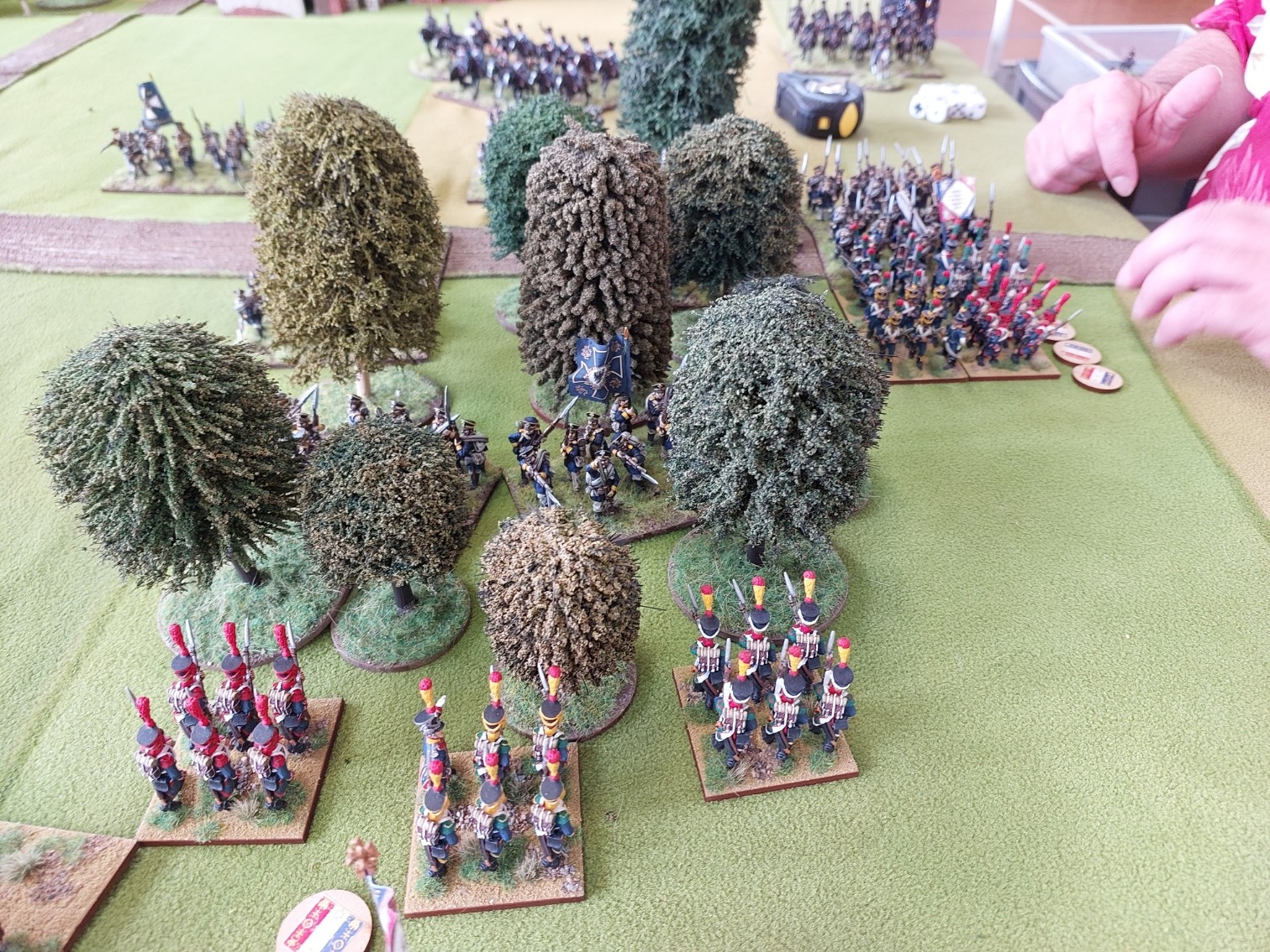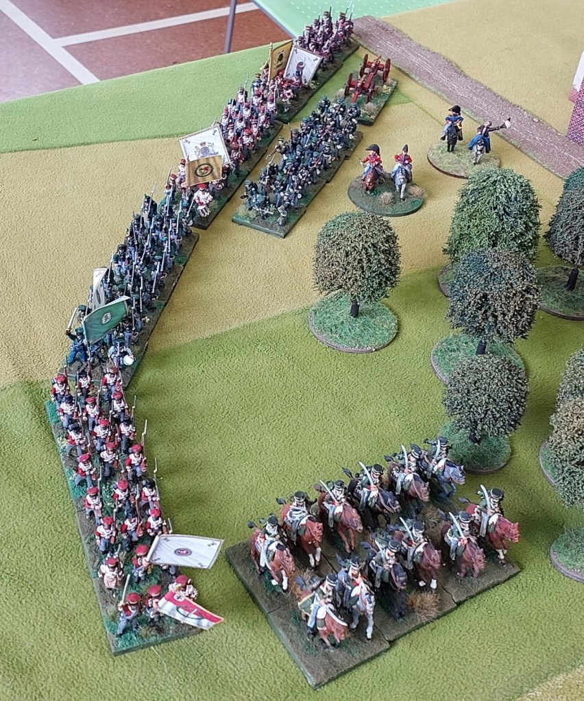 Sadly my camera played up…the light gets dodgy in the hall in the afternoon and the pictures from this flank were to blurry. But I had taken the flank wood…. put batteries either side of it and was moving 8 undamaged bttns forward supported by Dragoons. Below is final part of turn…Dragoons forced a square and 2 columns hit it…French survived!
