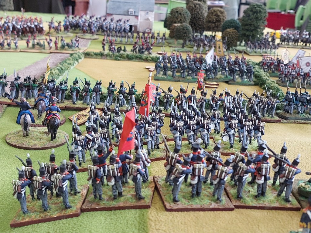 A look down the flank…..the initial French attack is repelled. I have moved Grenadiers up to line the riverbank and Graeme has moved his Grenz into the Village.