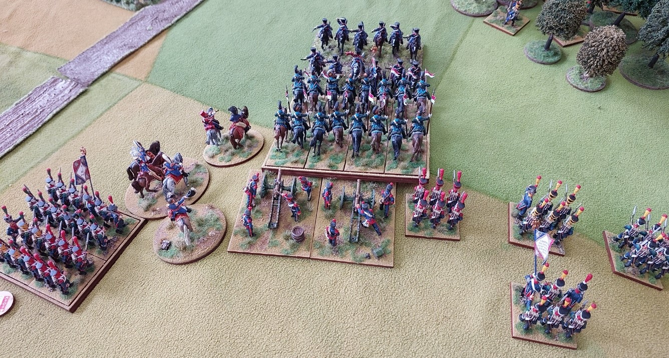 Robert threw his last light cavalry regiment into blunt the infantry advance making them form square. I retaliated with Cuirassiers…the French lost. Grenadiers and artillery are moving up.