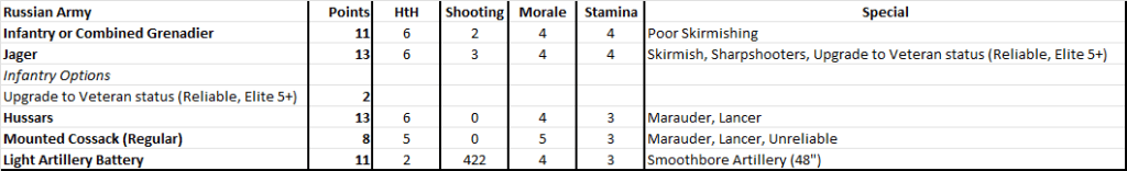 Below is my Russian point list. I upgraded the Jager to Reliable for reasons that will explain in report(apart from having the points spare!)