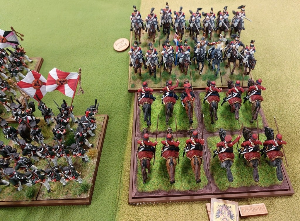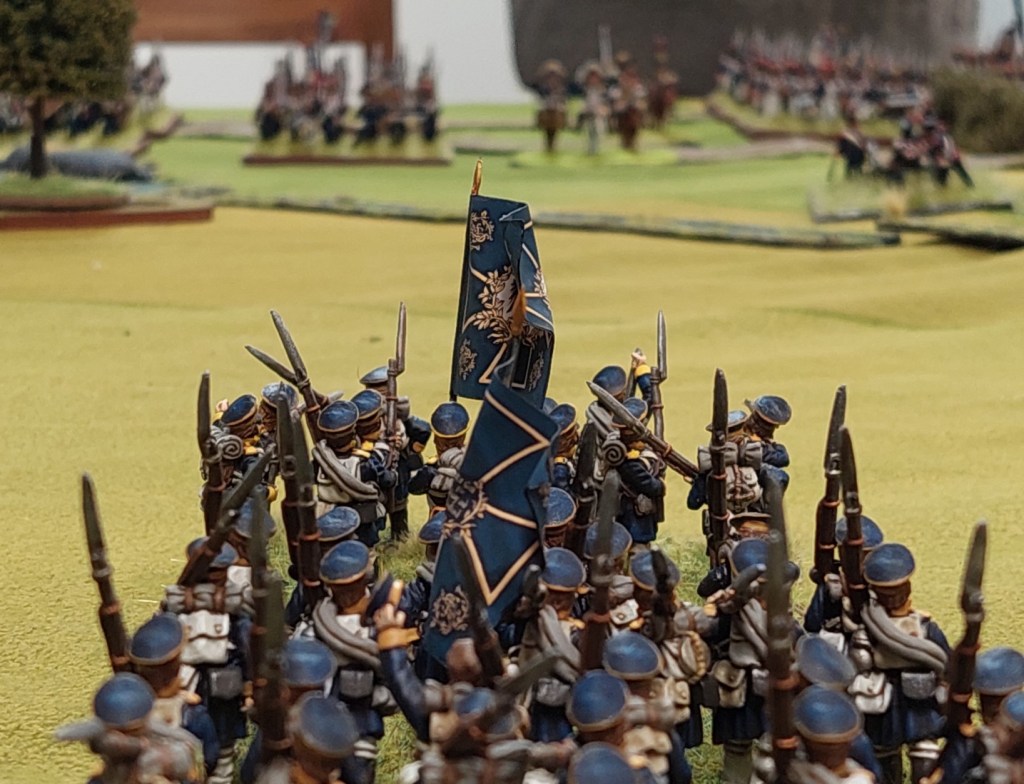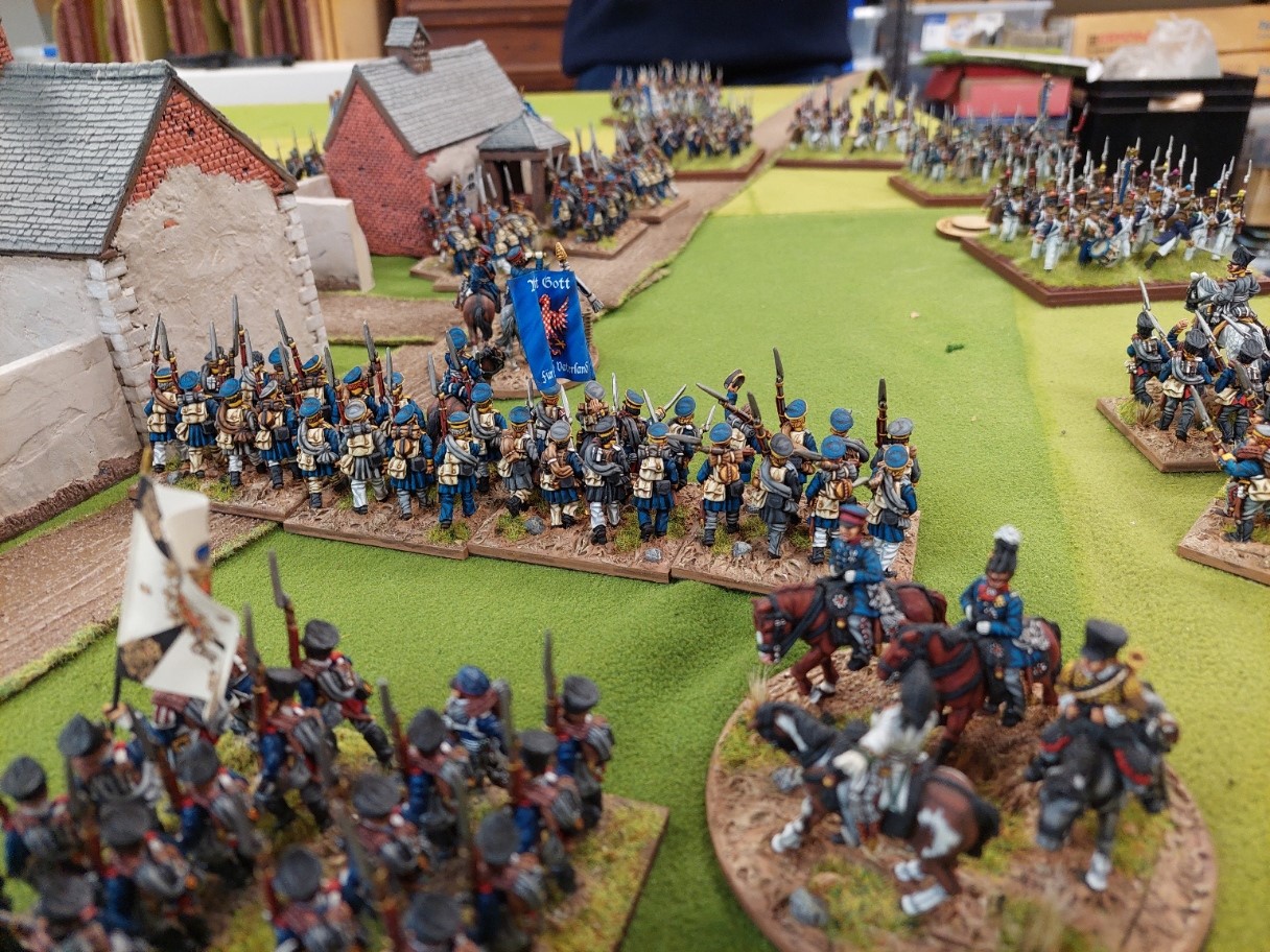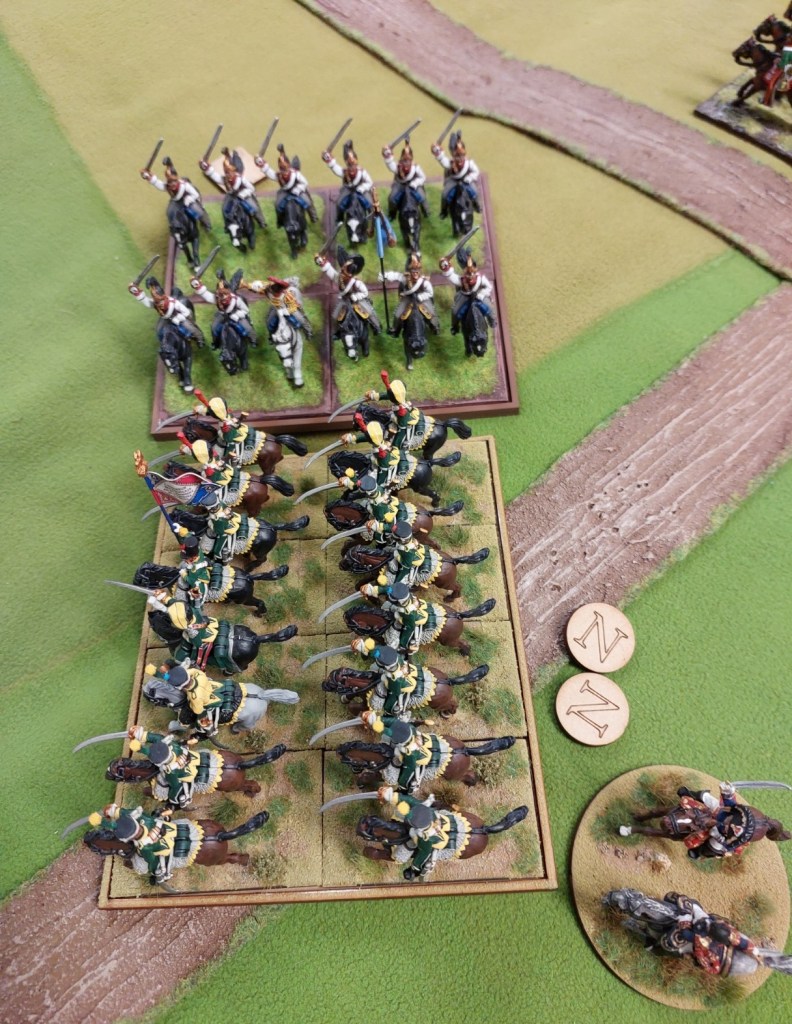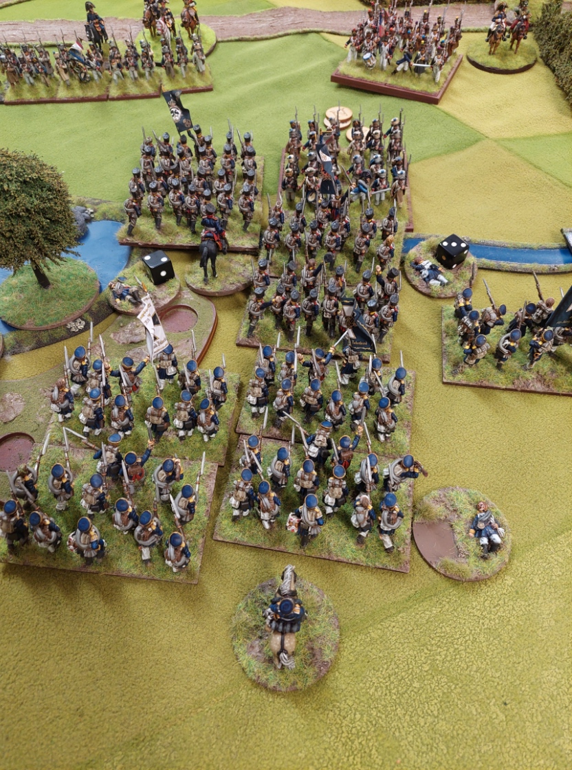 Graham charged some Chasseurs into the skirmishing Jager who evaded…the cavalry redirected onto the Landwehr who formed square. The cavalry retired…and are missing from this picture as they then got shot to smithereens.